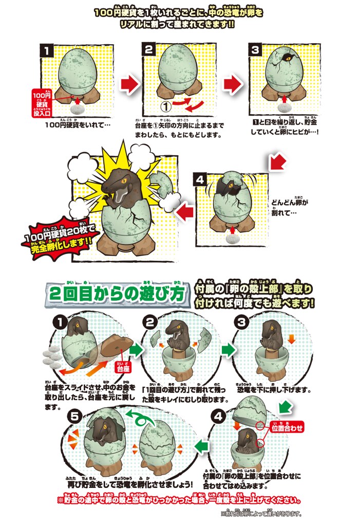 「恐龍孵化 創意存錢筒」以恐龍蛋為造型,三款陣容分別為霸王龍、三角龍、翼龍。每款尺寸約高115mm,存入日幣百元硬幣後,即可看見蛋內恐龍逐漸破殼的過程,隨著存入的金額越多,恐龍就會孵化的越快!不只可以讓孩子享受存錢的樂趣,看著恐龍孵化的過程也能滿足大大小小的恐龍迷!(可惜的是規格僅限定投入100円日幣)預計還會有第二彈推出,玩具人期待看見什麼恐龍呢?