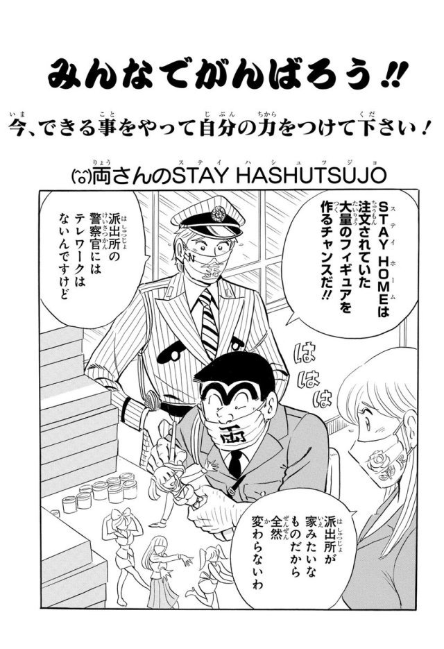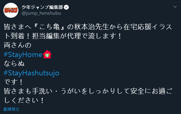 JUMP 編輯部也在官方推特內文表示:「秋本治老師給大家的《烏龍派出所》在宅應援插畫已送達,也由我們責任編輯代理傳達了!不是 #StayHome 而是 #StayHashutsujo!」,在最後編輯部也不忘呼籲讀者務必確實做到勤洗手、多漱口,一起安全的度過這次的危機!