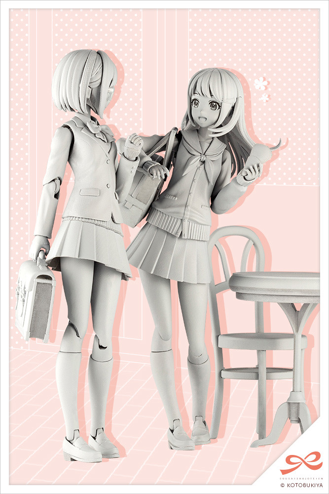 第一彈將推出天真爛漫的「結城MADOKA【桃櫻高中・冬季制服】」,透過組裝模型創造青春洋溢的女高中生,套件內附長直髮、後馬尾、雙馬尾三種風格的髮型以及四種表情零件,能夠呈現造型多變、情感豐富的姿態,同時頭部零件可與《女神裝置》《骨裝機娘》系列通用,玩法更多樣。