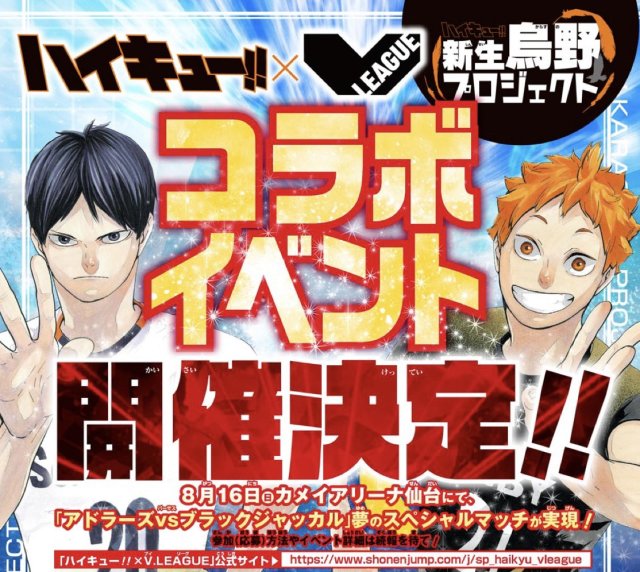 在本月 18 日時,《排球少年!!》官方宣布與 日本 V LEAGUE 進行合作宣傳活動,正巧的是,目前 V LEAGUE 為日本男子及女子排球所安排的最高級別聯賽,正好對應了現在漫畫劇情講述著主角日向翔陽和影山飛雄所在的職業聯盟之中。