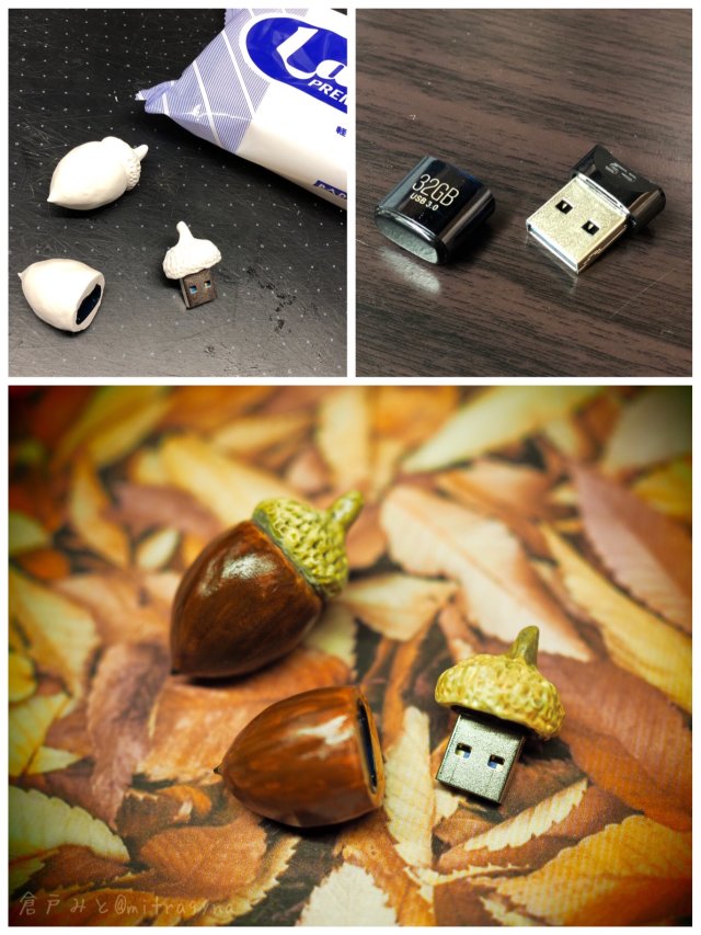 這個可愛的橡果子造型隨身碟,是由一位叫做倉戸みと(@mitragyna)的推主利用輕黏土製作而成的,作法也相當地簡單,除了黏土外,你只需要具備一個小型的隨身碟,以及你靈巧的雙手分別捏成果實與蒂頭的部分,也就是隨身碟的機身與蓋子,最後再用水彩或是壓克力顏料上色,搭啷一聲~就完成了,是不是很簡單呢!