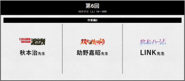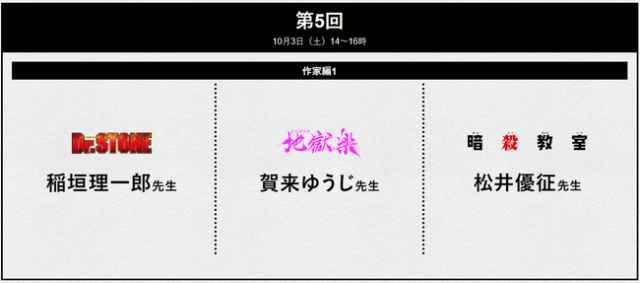 相信大家最在意的還是這些作者的陣容吧,這次講座請來了《Dr.STONE 新石紀》、《地獄樂》、《暗殺教室》、《烏龍派出所》、《雙星之陰陽師》、《終末的後宮》...等這些作品的老師們親臨現場當講師,可謂是砸了重本,重點是講座費用居然只需要2萬2000日圓(含稅)!!