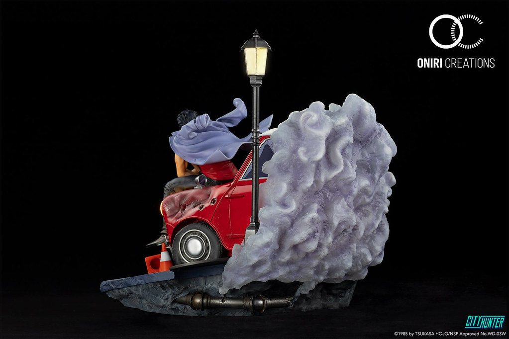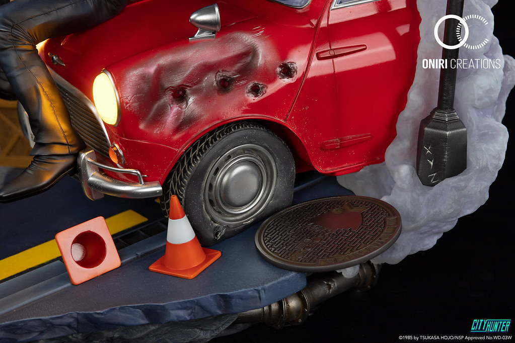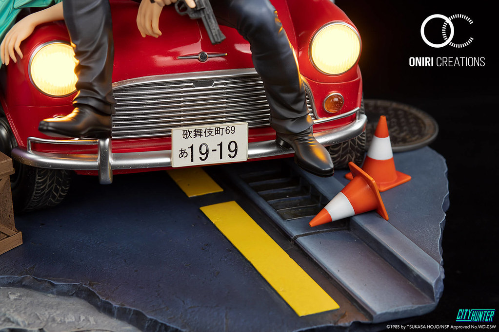 「城市獵人35週年紀念雕像 」為1/6比例,尺寸全高約40公分、寬45公分,以劇中標誌性的紅色 Mini Cooper為主體之一,帶有漂丿趕的阿獠坐在車頭,而阿香則是倚靠在車側身,形成完美的城市獵人陣容。巧妙地將新宿街頭發生的刺激槍戰濃縮在這個靜態作品之中:阿獠肩上披著隨風擺動的外套,手中拿著愛槍.357麥格農,身後揚起了濃濃的煙霧,Mini不但充滿彈孔,輪胎與車頭也損壞了。