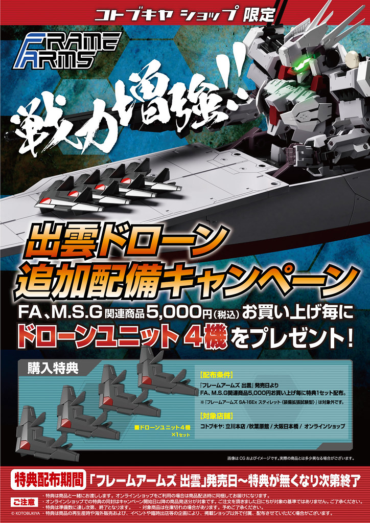 ▼ 自「骨裝機兵 出雲」發售日起,凡在壽屋官方商店 KOTOBUKIYA 購買《骨裝機兵》、《M.S.G》系列商品每滿 5,000 日圓即可獲得一組「出雲無人攻擊機」特典(骨裝機兵 SA-16Ex 短劍【スティレット】裝備擴張試驗型不包含在內)。