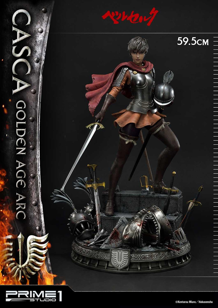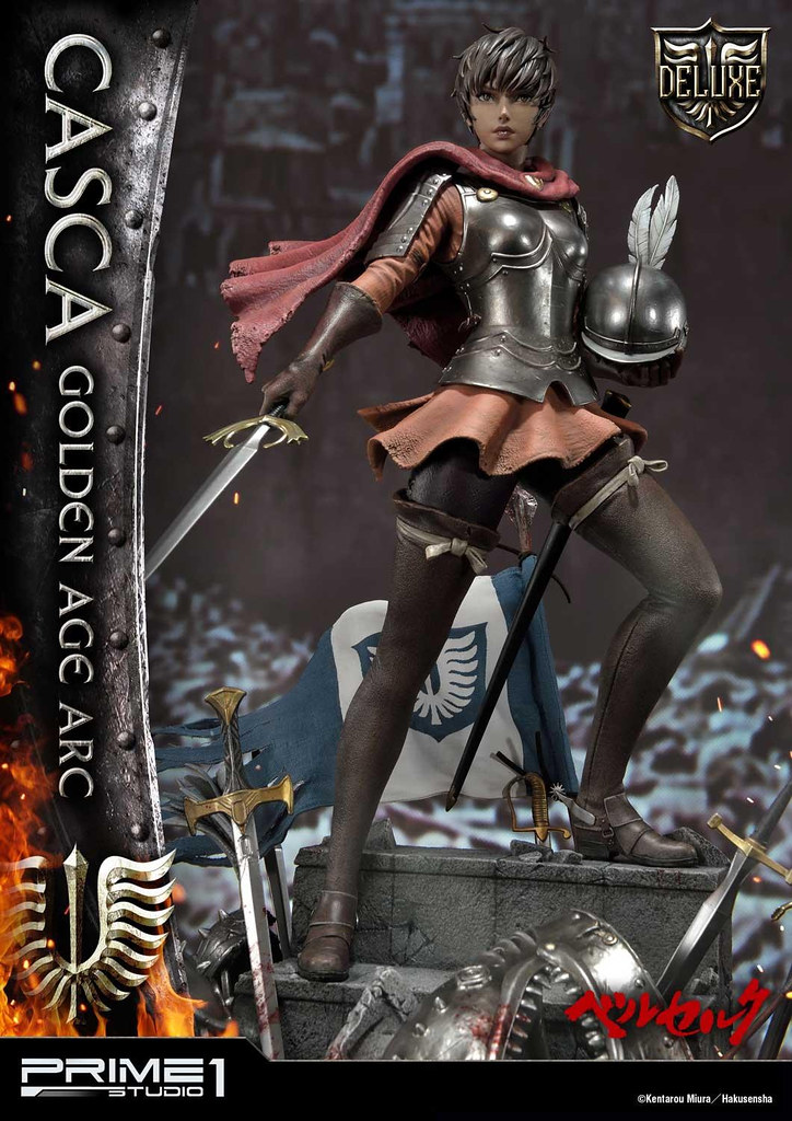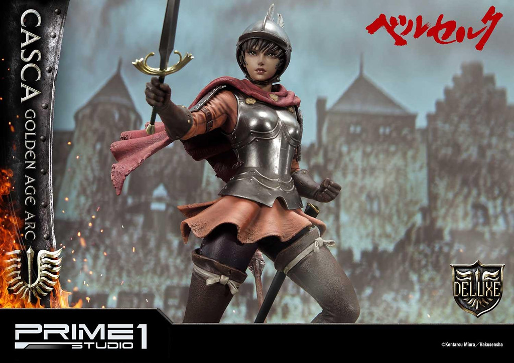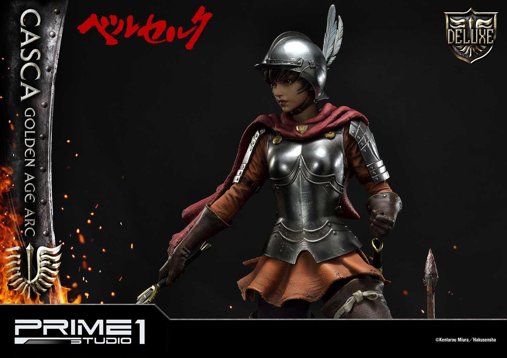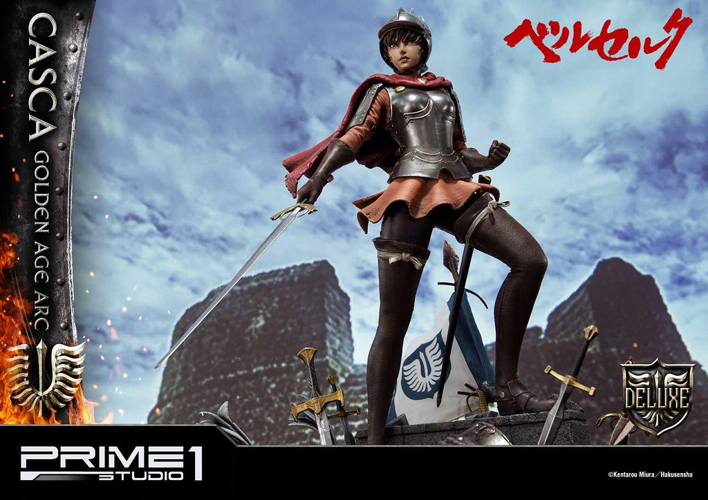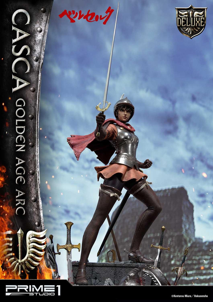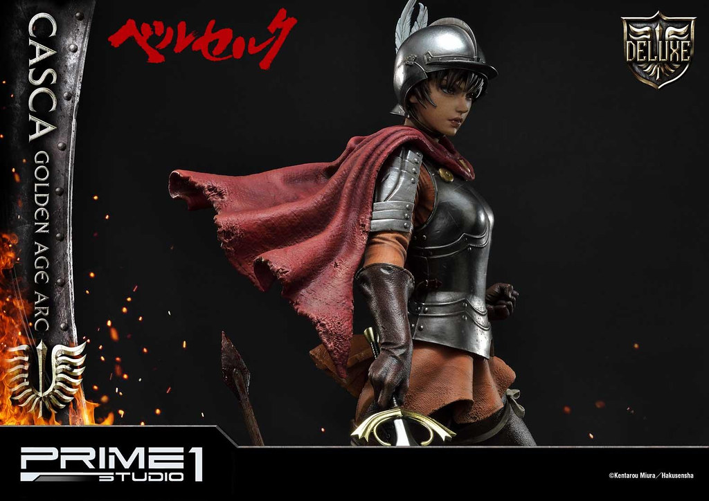 「1/4 比例 喀絲卡(黃金時代)」高約 59.5 公分,高度再現了她身穿盔甲手持長劍與頭盔的造型,黝黑的皮膚與銳利的眼神出色地還原,並細緻地製作出銀色盔甲、短披風、手套的各處細節與戰損、破舊的痕跡,精美的塗裝更展現出逼真的質地差異,本作附屬了兩種持劍的右臂零件,而在 DX版中更追加了戴上頭盔的頭雕、空手狀態的左手、藍白主調的鷹之團旗幟,擺設起來更加豐富、變化性再提升!