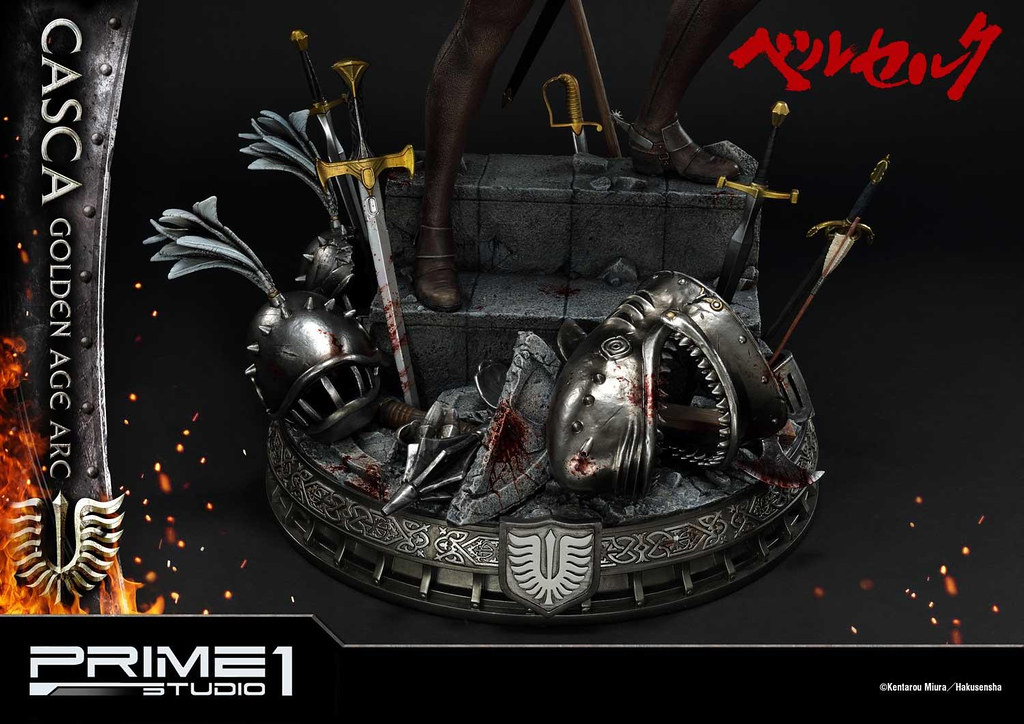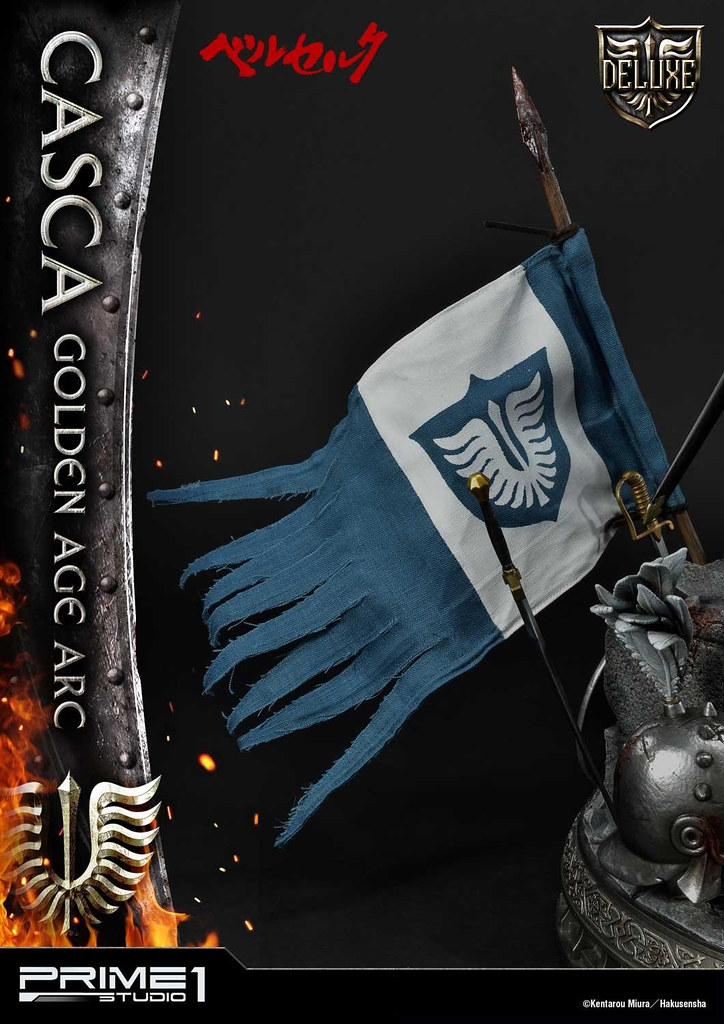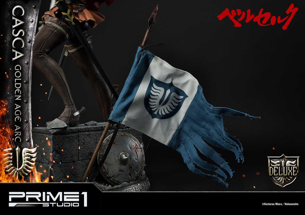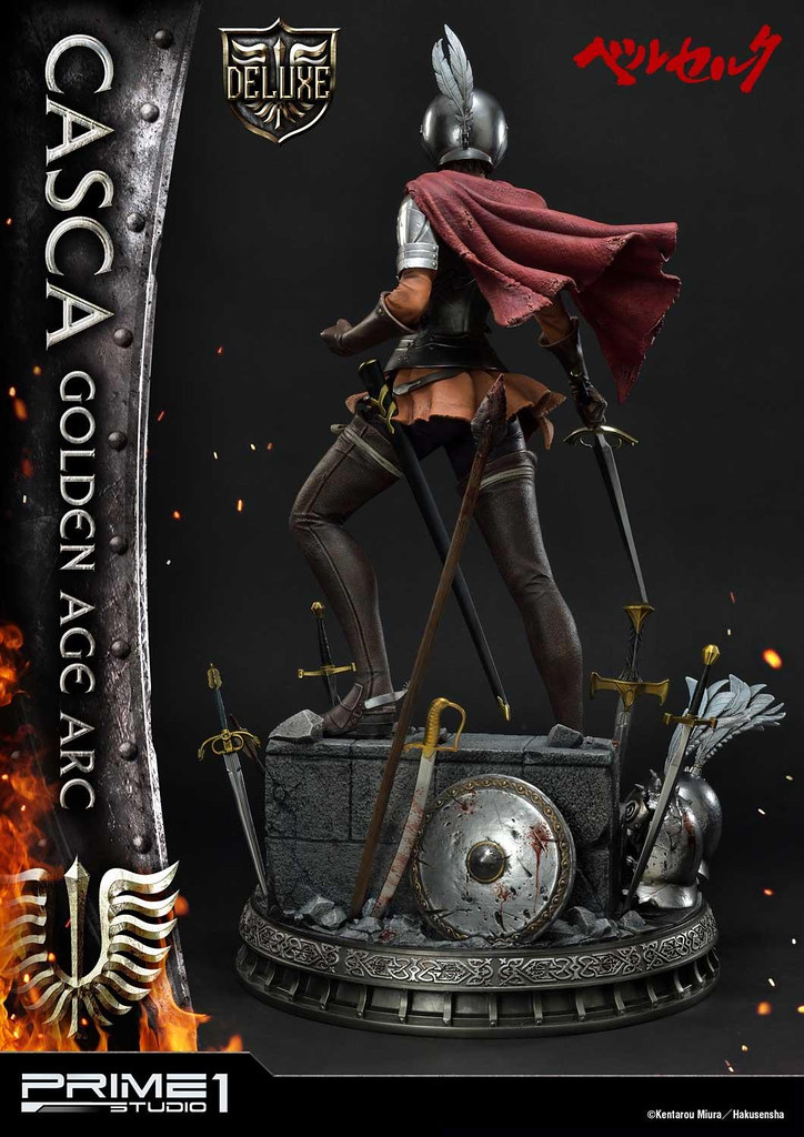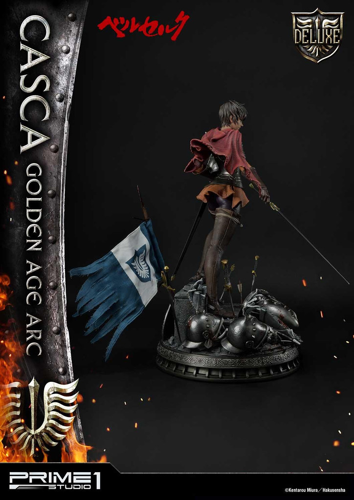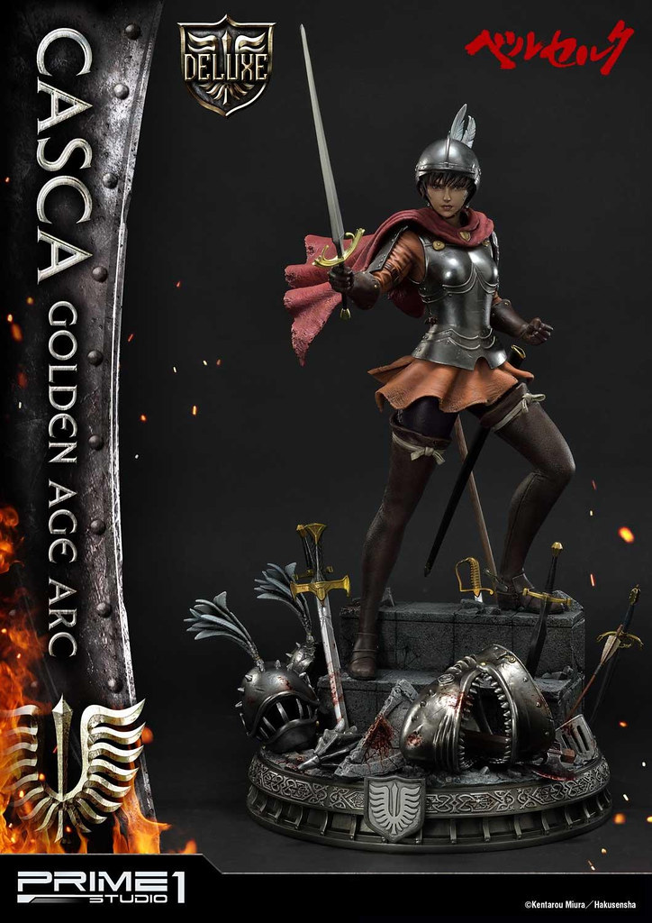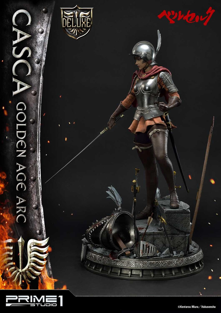 「1/4 比例 喀絲卡(黃金時代)」高約 59.5 公分,高度再現了她身穿盔甲手持長劍與頭盔的造型,黝黑的皮膚與銳利的眼神出色地還原,並細緻地製作出銀色盔甲、短披風、手套的各處細節與戰損、破舊的痕跡,精美的塗裝更展現出逼真的質地差異,本作附屬了兩種持劍的右臂零件,而在 DX版中更追加了戴上頭盔的頭雕、空手狀態的左手、藍白主調的鷹之團旗幟,擺設起來更加豐富、變化性再提升!