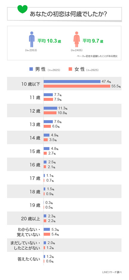 先來看看初戀,根據調查結果顯示,日本男性的第一次戀愛平均就落在 10 歲左右,而女性情竇初開的年紀則是落在 9 歲這個歲數,而這個年紀剛好也是孩子們剛開始學著欣賞他人的一個階段,而且從數據結果來看,女孩子似乎比男孩還來得早一些呢!