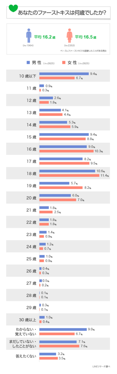 再來看到令人害羞的 First Kiss 啦!在這項目的統計結果中可以看到,男生女生平均都是落在 16 歲,正好是剛上高中一年級的時候呢!人家都說 16、7歲的戀愛總是讓人永生難忘,與喜歡的人第一次近距離的嘴唇接觸,當下心情肯定是緊張得要命啊!
