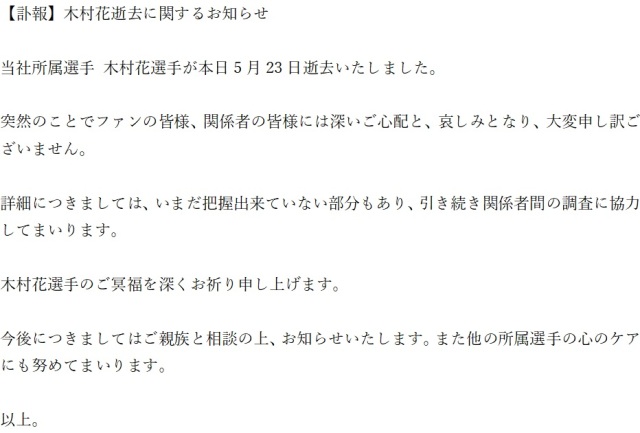 參與演出 Netflix 日本戀愛實境節目《雙層公寓》的女摔角選手木村花,在今日(23)稍早驚傳自殺身亡的噩耗,並由她的事務所公司 スターダム✪STARDOM 透過推特證實此消息,得年 22 歲。