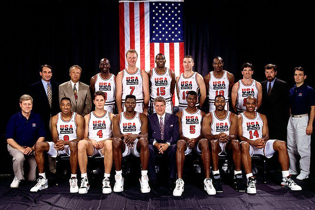 託 1989 年國際籃壇更改規則,允許職業球員可以參加奧運的福,美國徵召多位 NBA 好手加入男籃代表隊進軍西班牙奧運,組成第一代夢幻隊。當年除了喬丹之外,成員還包括他的好戰友皮朋(Scottie Pippen)、「大鳥」柏德(Larry Bird)、「上帝的左手」穆林(Chris Mullin)、猶他爵士隊的擋拆組合:「郵差」馬龍(Karl Malone)和史塔克頓(John Stockton),以及「光頭惡漢」巴克利和魔術強森等人。集結眾多球星的初代夢幻隊,果然也奪下該季奧運的男籃金牌。