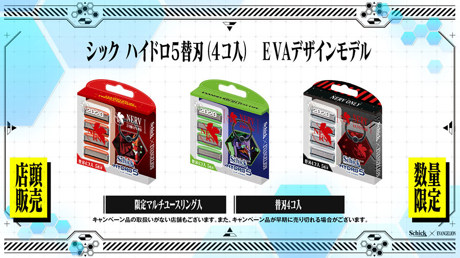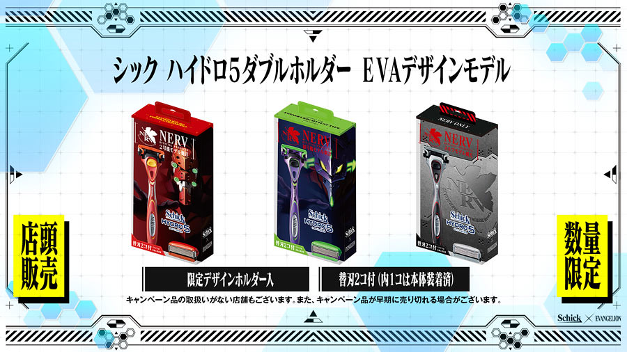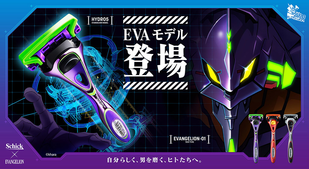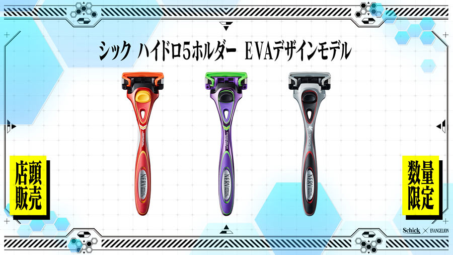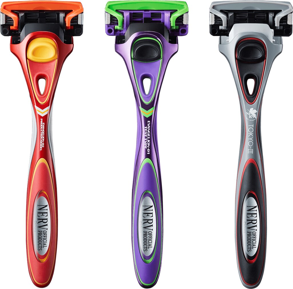 以「初號機」、「二號機」及「NERV」作為刮鬍刀的設計靈感,分別推出帥氣且具有質感的造型配色。除了配色以外,在刮鬍刀刀身也各別印製有「EVANGELION TEST TYPE-01」、「EVANGELION-02」與「TOKYO-Ⅲ」的字樣,刮毛也充滿 EVA 風格!