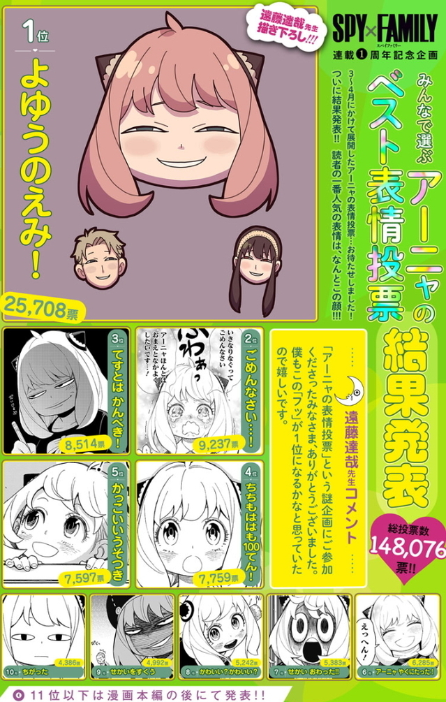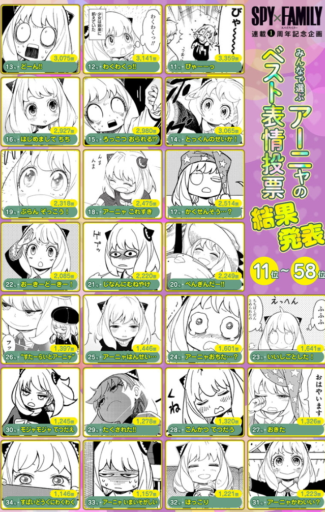 在劇中浮現在各位腦內各種各樣的表情中,作者「遠藤達哉」特別挑出了58種安妮亞的表情做出了這個企劃,另外遠藤老師還額外為從總投票數15萬票中得到了第一名的讀者畫出了表情。