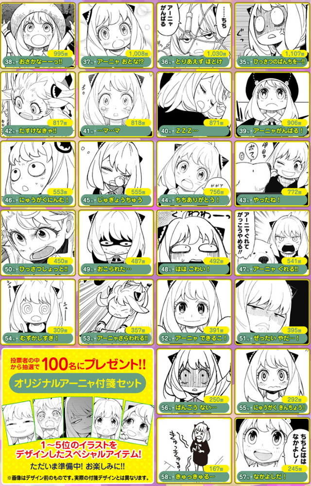 除此之外,前五名的表情會另外設計出一套「原創安妮亞便利貼套組」,並從投票者中抽出100名幸運者作為禮物送出。
