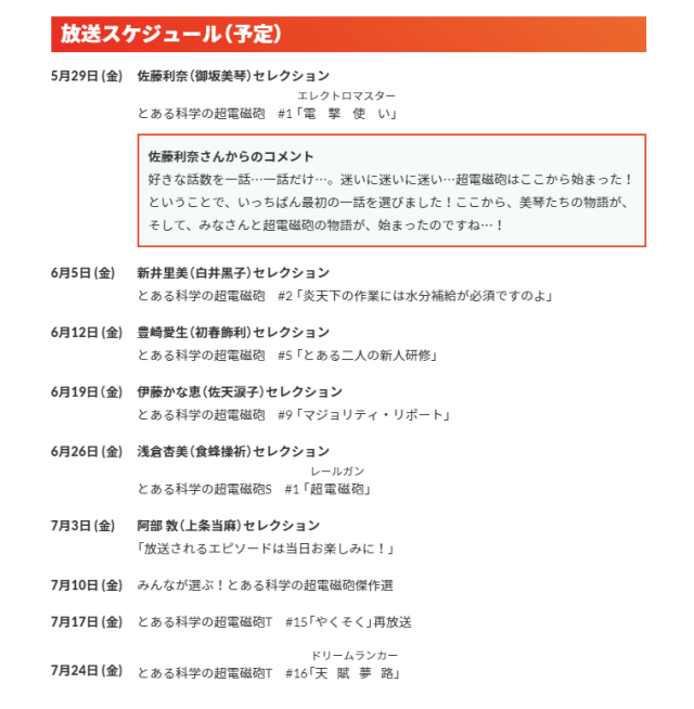 不過,在這期間大家也不會閒著,因為從5月29日開始到6月26日將由本作參與的聲優們各從《科學超電磁砲》與《科學超電磁砲S》選出一集來播放,而7月10日則是播放由觀眾們票選的精選集,從《科學超電磁砲》第1話至《科學超電磁砲T》第14話中選擇自己想要看的一集,得票最高的那集將會在7月10日播出。