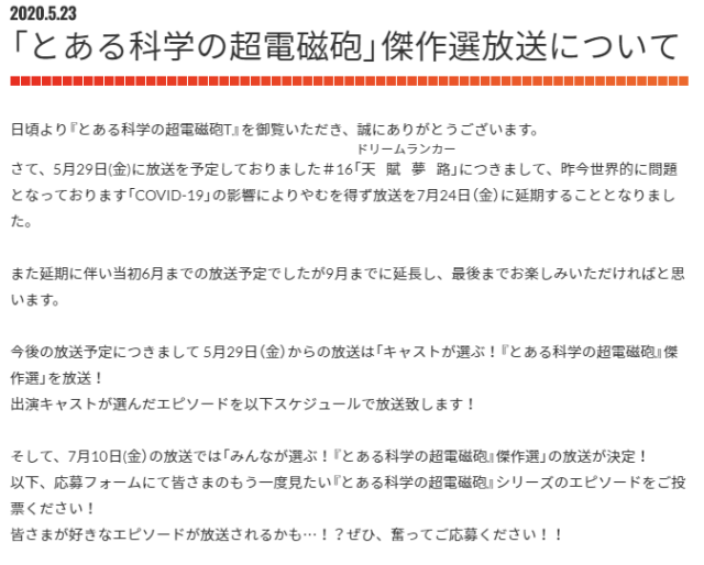 由鐮池和馬原作、冬川基作畫的《魔法禁書目錄》衍生外傳漫畫《科學超電磁砲》,其電視動畫系列在2020年1月10日開始播映全新一季《科學超電磁砲T》,然而因疫情影響的關係,播放時程一再耽誤,5月23日官方又再度公布延期播放的壞消息。