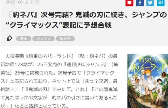 五月二十五號,日本《週刊少年JUMP》連載的《約定的夢幻島》來到178話,卻在最後環節出現了クライマックス(CLIMAX 最高潮) 字樣。