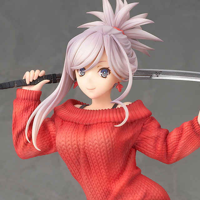 宮本武藏 私服Ver.」1/7比例模型,有別於華麗美豔的和風服飾,換上了休閒的私服-寬鬆紅色毛衣,搭配菱格大腿襪與短靴,整體造型相當俏麗。迷人的微笑,搭配單腿輕巧的立姿,露出細長大腿,膚色與鮮紅的毛衣形成對比;精緻的毛衣皺褶藏不住凹凸有致的身體線條,加上可拆卸的設計,可以展現內搭白色小背心與緊身熱褲的造型,充滿成熟魅力。另外刀身部份施以鋼色金屬色塗裝,並有細膩刀紋,帶有強烈存在感~