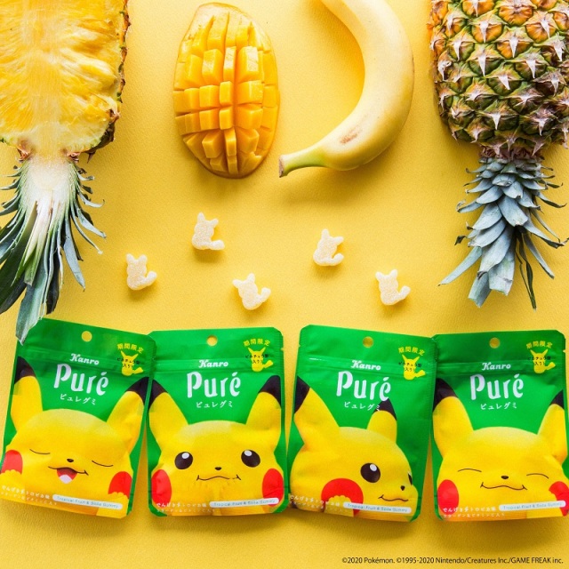 黃色與綠色交錯的期間限定,封面呈現一百分的熱帶氣息,讓人意識到夏天即將到來,內容物的軟糖造型也搖身一變,從心形換成了皮卡丘的形狀,聯名誠意十足,設計也相當符合水準。