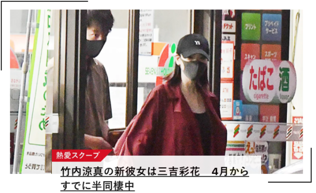 而才剛與交往兩年,並且論及婚嫁的吉谷彩子分手後一個月,在日前就被日本媒體 FRIDAY 目擊到與日本 23 歲模特兒三吉彩花,兩個人在便利商店購物完,便坐進白色賓士車,據說車內還有其他兩名南性與一名女子,直到最後只剩下竹內與三吉兩人,雙雙走進竹內的住處,並且正處於半同居狀態。