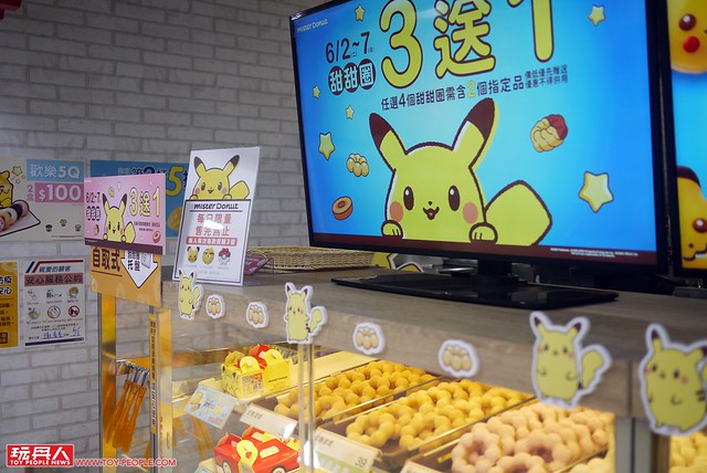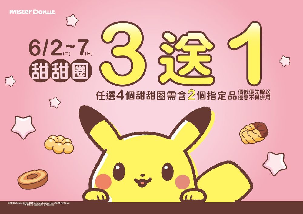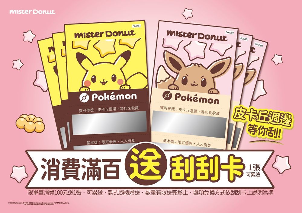 活動方式:活動期間單筆消費滿百即可獲得「刮刮卡」乙張,有機會刮出「甜甜圈買5送5」、「買現做飲品送甜甜圈」、「甜甜圈買4送2」等優惠,還有皮卡丘週邊商品及Mister Donut獨家寶可夢瓷盤等好禮。