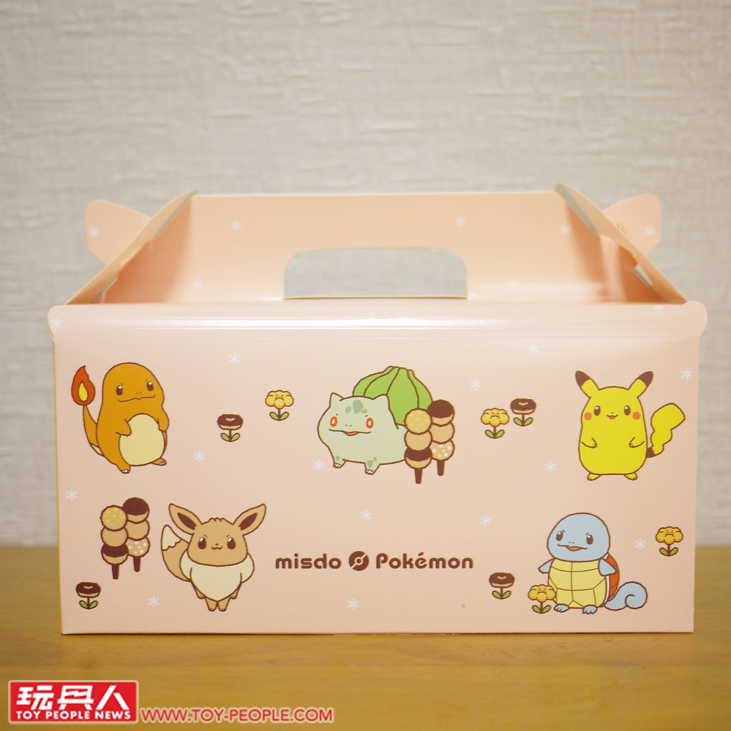 ▼外帶盒的一面為橘色調、一面是粉綠色系,角色共有皮卡丘、伊布、小火龍、傑尼龜和妙蛙種子,超級萌!