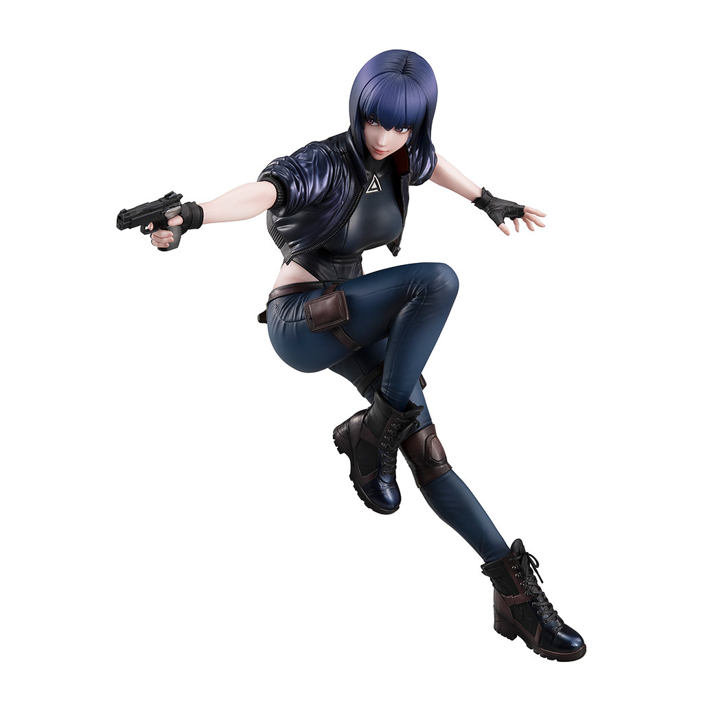 「草薙素子」PVC塗裝完成品,尺寸約高 200mm,將《攻殼機動隊 SAC_2045》版本的素子如實呈現,重現完美的身材和俐落的造型,臉部自信的表情和舉槍得躍動姿勢相當帥氣!服裝方面也十分精緻,皮夾克、高叉緊身衣與皮手套皆有質感的塗裝。槍枝與皮鞋等配件也充滿精彩細節。