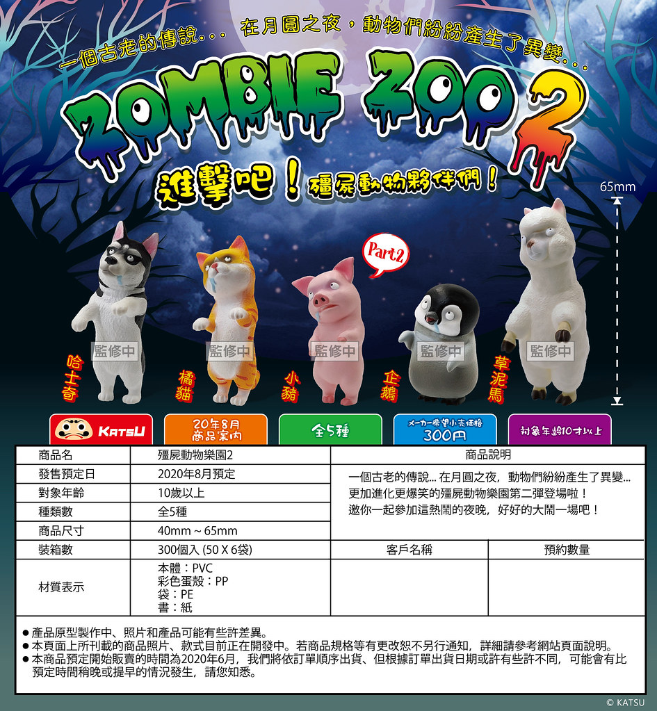 台灣新銳玩具廠牌「KATSU 創作工房」,在推出了人氣話題的「殭屍動物樂園」轉蛋作品後,又將好評再推出第二彈「殭屍動物園 2」(ZOMBIE ZOO 2)轉蛋啦!一套共有五種款式,一轉參考售價為100元新台幣,預計將於2020年08月發售。