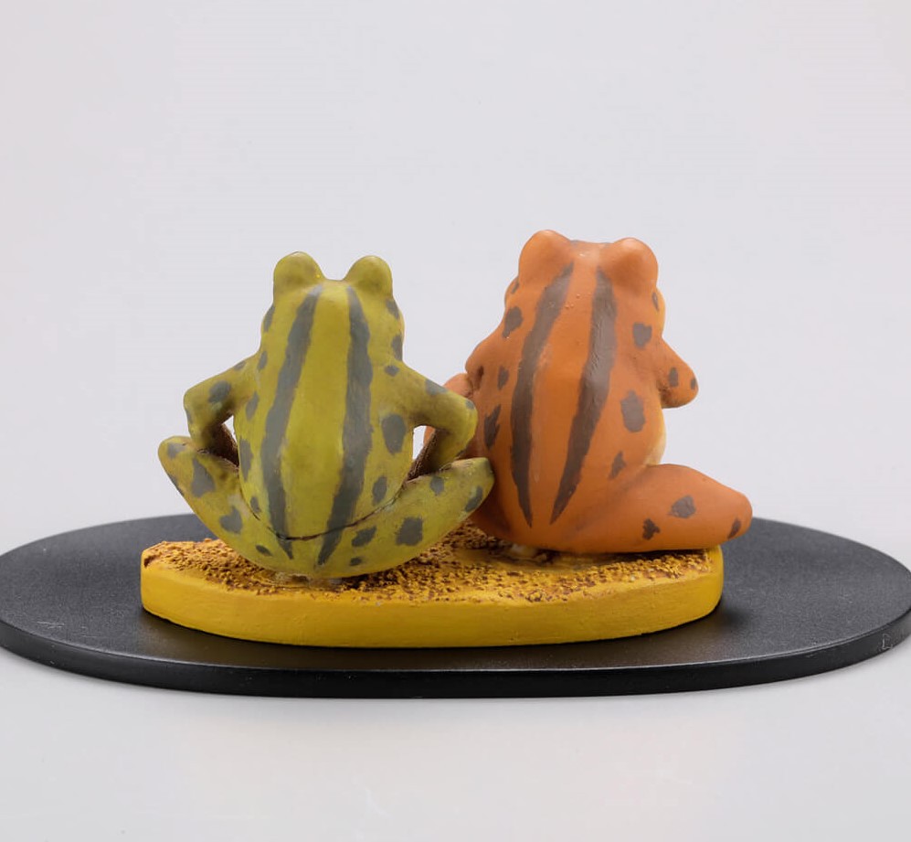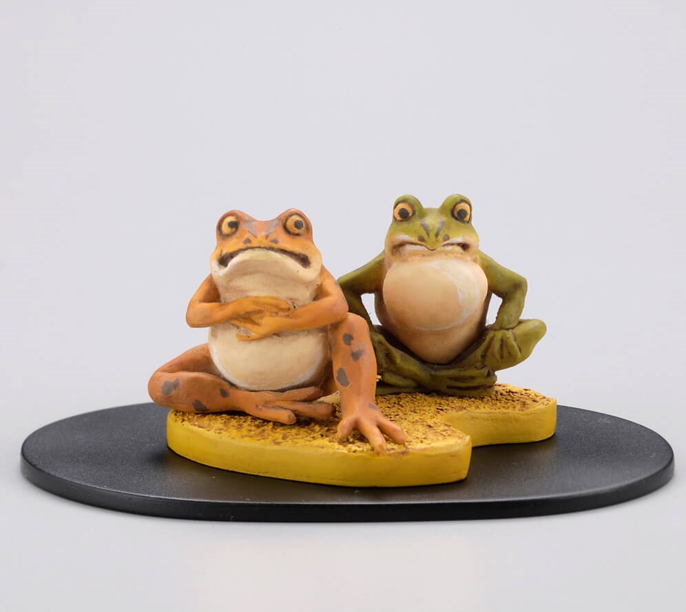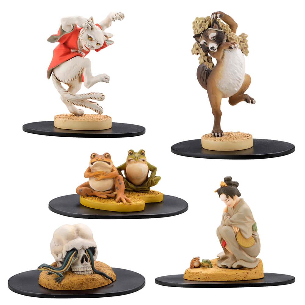 「miniQ 河鍋曉齋《畫鬼盆景》」盒玩,尺寸高約 3 ~ 5.5 公分,分別為《風俗鳥獣画譜》中的「髑髏與蜥蜴」(髑髏と蜥蜴)、《鳥獣戯画》中的「猫又」、「狸」,《美人觀蛙戲圖》的「美人觀蛙」(美人観蛙戯図)、「蛙圖1」(蛙図1),生動將日本浮世繪藝術立體化,無論是精緻的真實感,還是造型的躍動感,都是喜歡浮世繪的玩具人不可錯過的收藏之一~