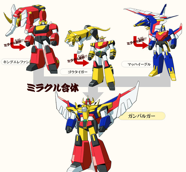 伏魔金剛(ガンバルガー)是由主角霧隠虎太郎、流崎力哉、風祭鷹介所駕駛的衝鋒虎、疾速鷹、象王三機合體而成的巨大機器人。與另外兩作《絕對無敵》、《熱血最強》最大的差異在於衝鋒虎、疾速鷹、象王這三架初始的機器人就具備從「動物模式」奇蹟變形為「鬥士模式」的機能,再進一步奇蹟合體為伏魔金剛,三架機體便擁有七種型態。要在組裝模型商品上重現複雜的合體.變形構造,相當有難度。