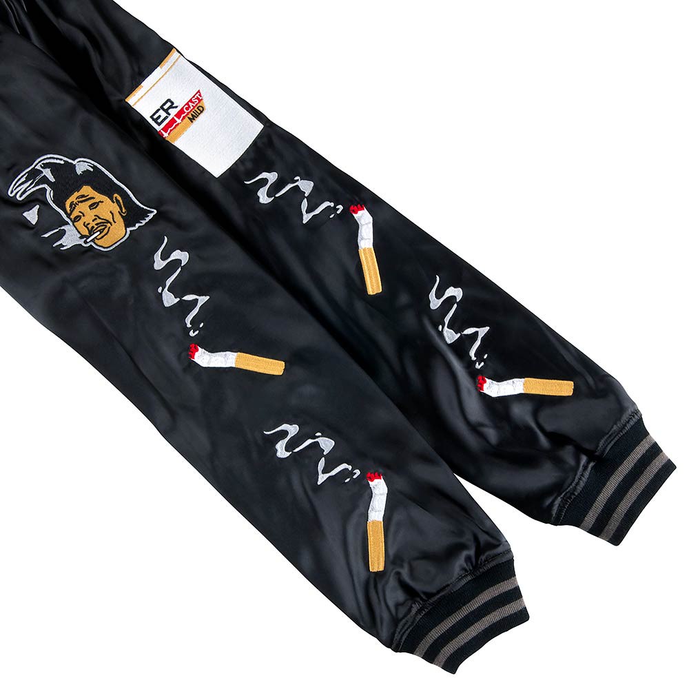 小鐵的爸爸,職業為計程車司機,是個無可救藥的老菸槍,一天要抽 26 包煙,平時性格懶散隨便,但只要碰上和菸有關的事物就會卯足全力!主色調為黑色系的「大鐵橫須賀刺繡外套」,毫不意外以菸為主題,背面刺有叼著菸的大鐵圖樣,正面則為霸氣的「鉄筋」字樣,兩邊的袖子上也是滿滿的香菸、菸盒,光用看的就能感受到滿滿菸味啦!