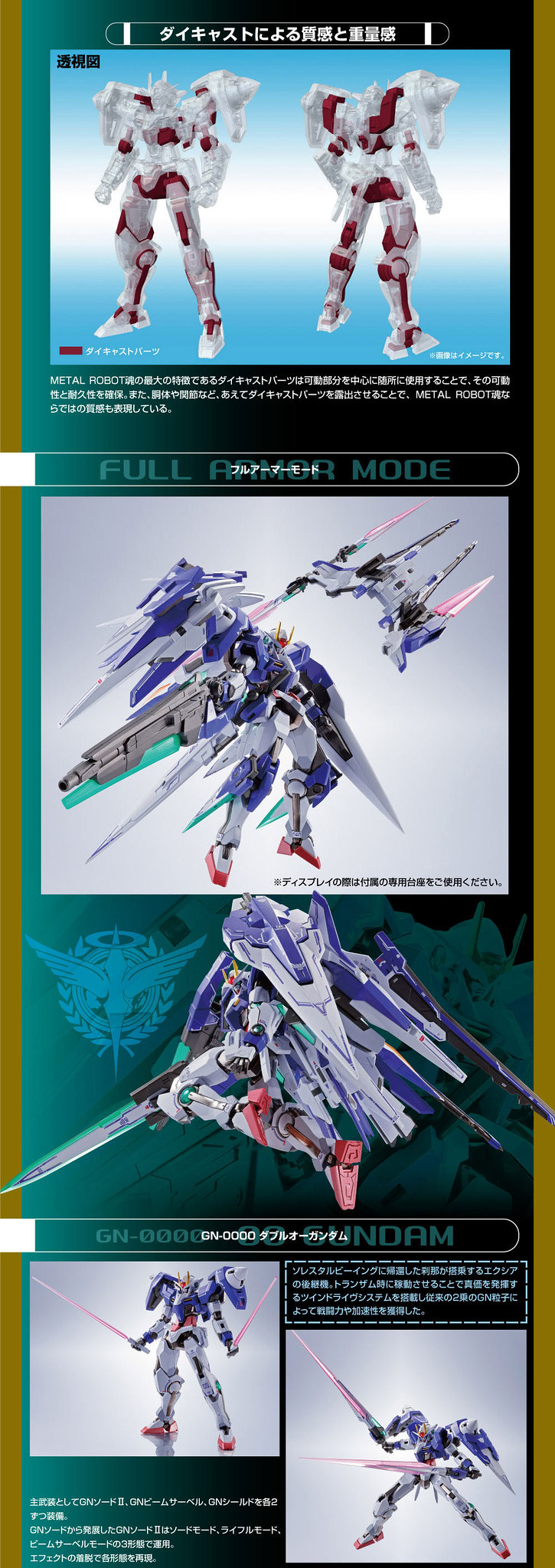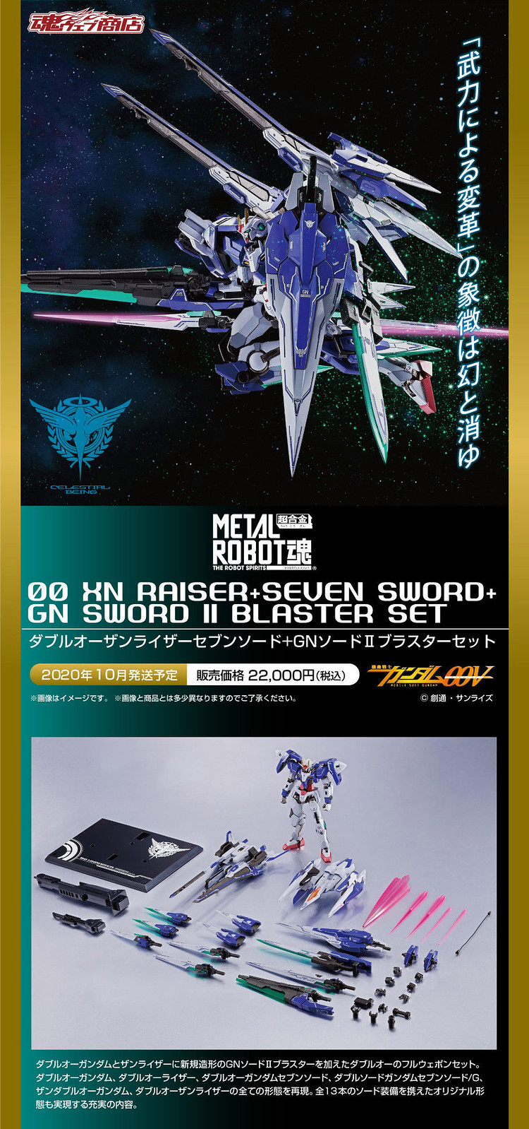 由日本 BANDAI SPIRITS 公司收藏玩具事業部 TAMASHII NATIONS 發行,結合厚重金屬質感、高度造型力、 可動結構的『METAL ROBOT魂』系列今(11)日發表了出自官方外傳《機動戰士鋼彈00V》的最新商品「METAL ROBOT魂 00斬擊強化模組+七劍+GN劍Ⅱ光炮型套組」預計於 2020 年 10 月發售的消息。