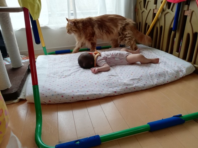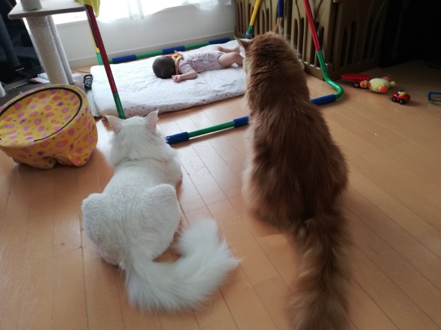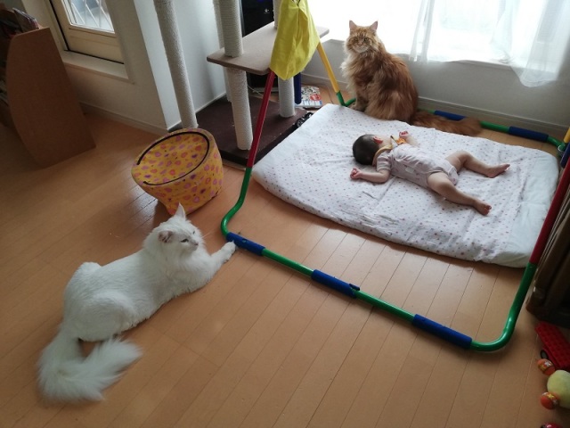 除了第一張小孩熟睡的特寫外,第二~四張都可以看到兩隻貓正圍繞著小孩走動、注視,彷彿就像看守著小孩不讓他受危險一樣,這種如「守衛」一般的舉動實在是相當有趣,在推特上已獲得4萬8千多的愛心。