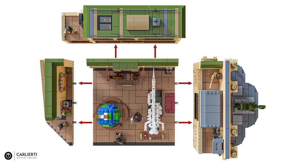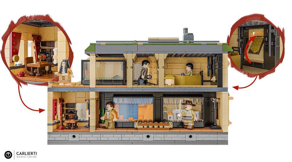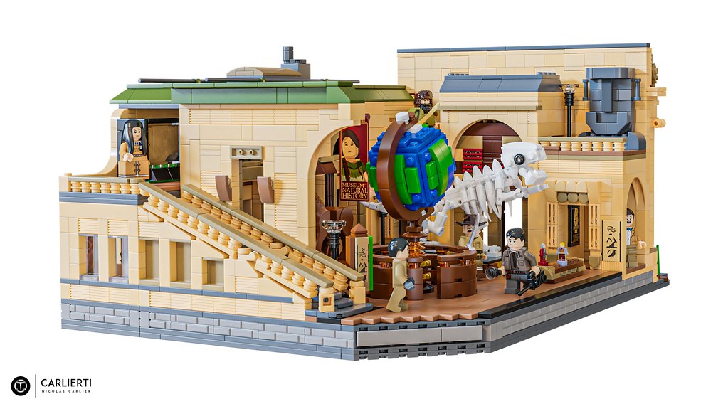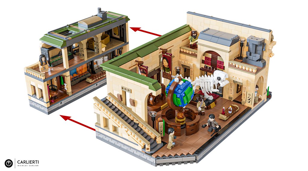 本作共計用上 2900 片零件,CARLIERTI 表示由於博物館是一個龐大又複雜的建築,更何況必須兼具外觀和內裝,很難精準地完整呈現,所以他選擇以《博物館驚魂夜》第一集的標誌性角色、元素為主,像是博物館門口的雕像、霸王龍化石模型、大型地球儀跟圓形櫃檯、上二樓的階梯跟可愛的摩艾石像 Dum Dum......等,形式上採用容易把玩的開放式建築呈現,不管是空間感還是場景設計都有著非常舒服的視覺效果,還設有容易拆開的卡榫結構喔。