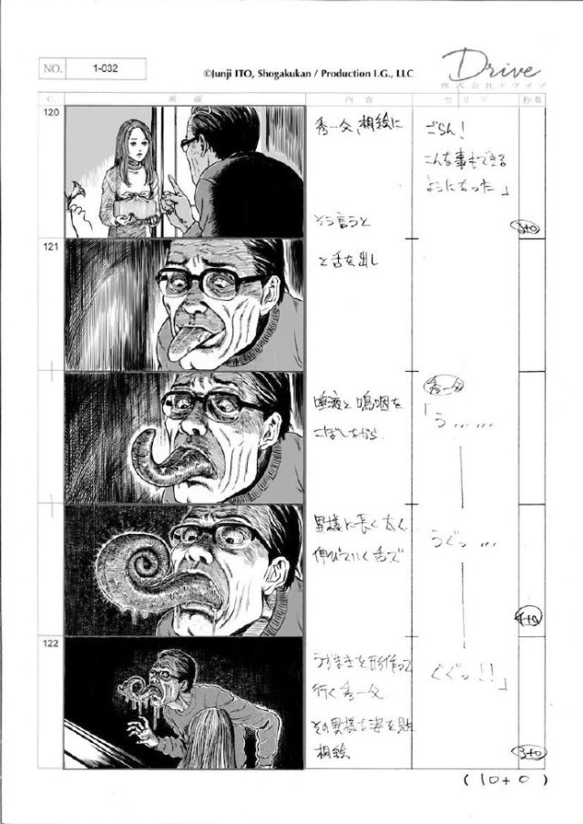 目前官方更公開據原作改編的動畫分鏡,《漩渦》的劇情描述一個受漩渦詛咒的「黑渦鎮」,這些城鎮住民被這些螺旋吸引,像是傳染瘋狂般迷漫開來,有人因此意外喪生,死狀居然還如漩渦一般…沒有人知到詛咒的開始與結束…