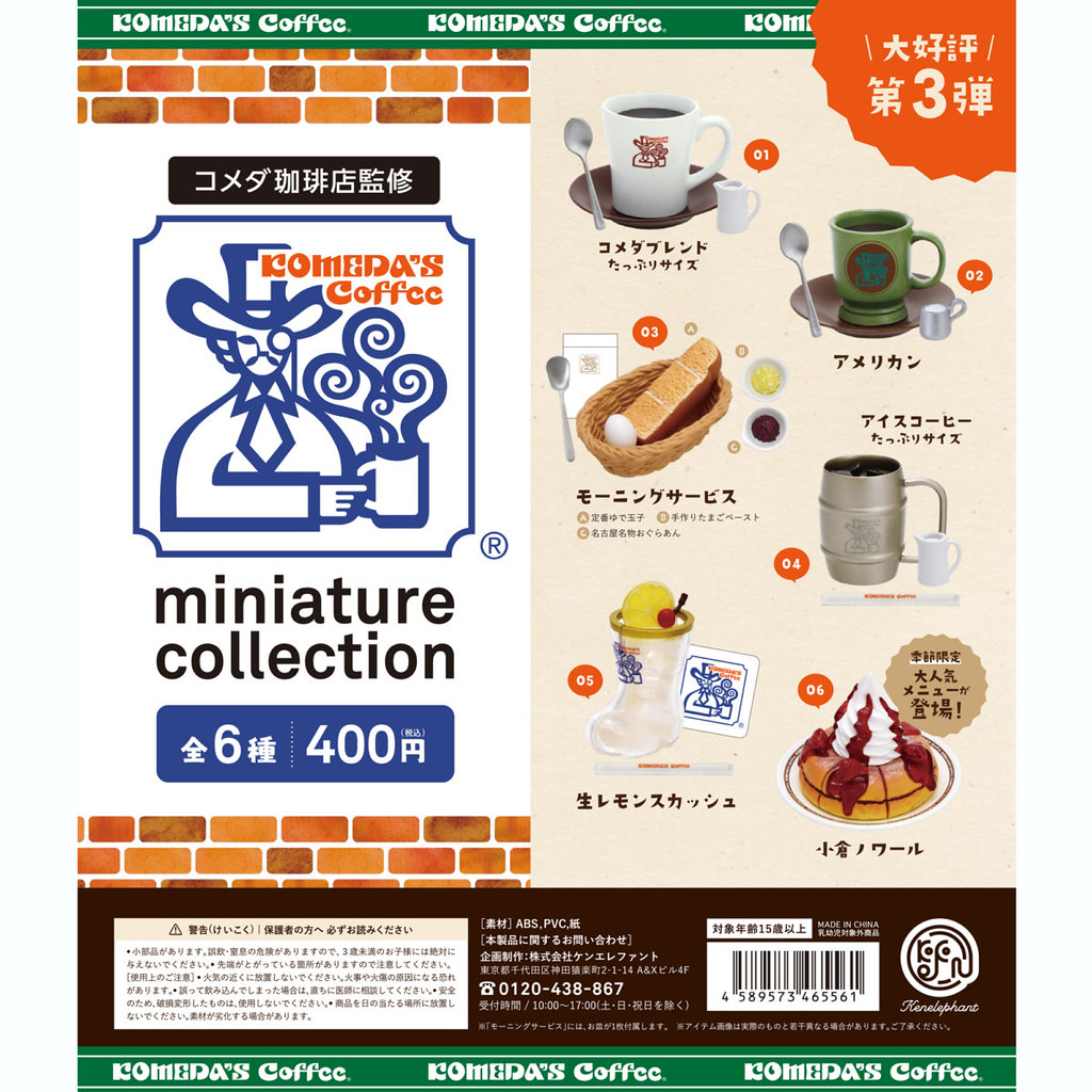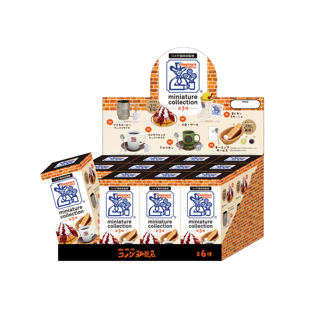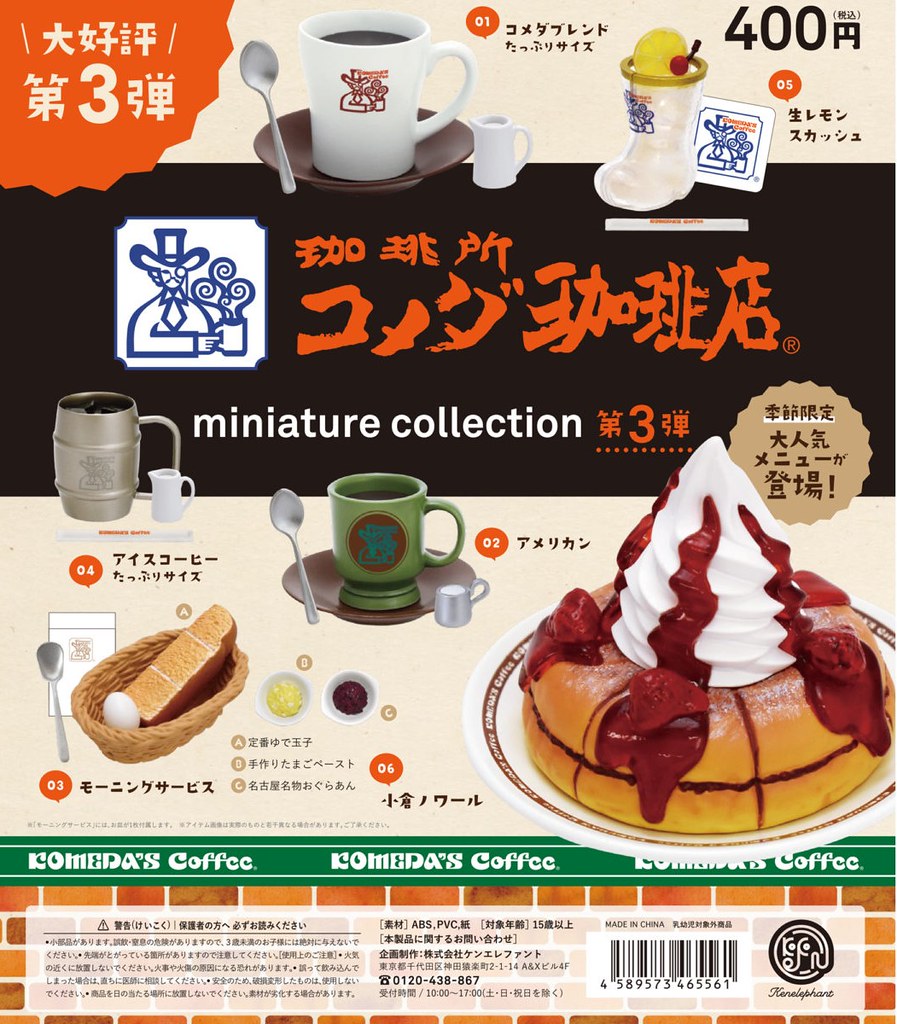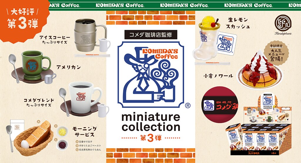 日本玩具公司「Kenelephant」(ケンエレファント)旗下將日本知名連鎖品牌的招牌名物料理化為微縮模型的盒玩系列,將推出以名古屋「Komeda’s coffee 客美多咖啡店」為主題的第三彈作品「珈琲所 客美多咖啡店迷你系列 vol.3」(コメダ珈琲店 ミニチュアコレクション vol.3),一共有 6 種款式,分別推出轉蛋與盒玩商品,預計在 2020 年 7 月下旬時販售。