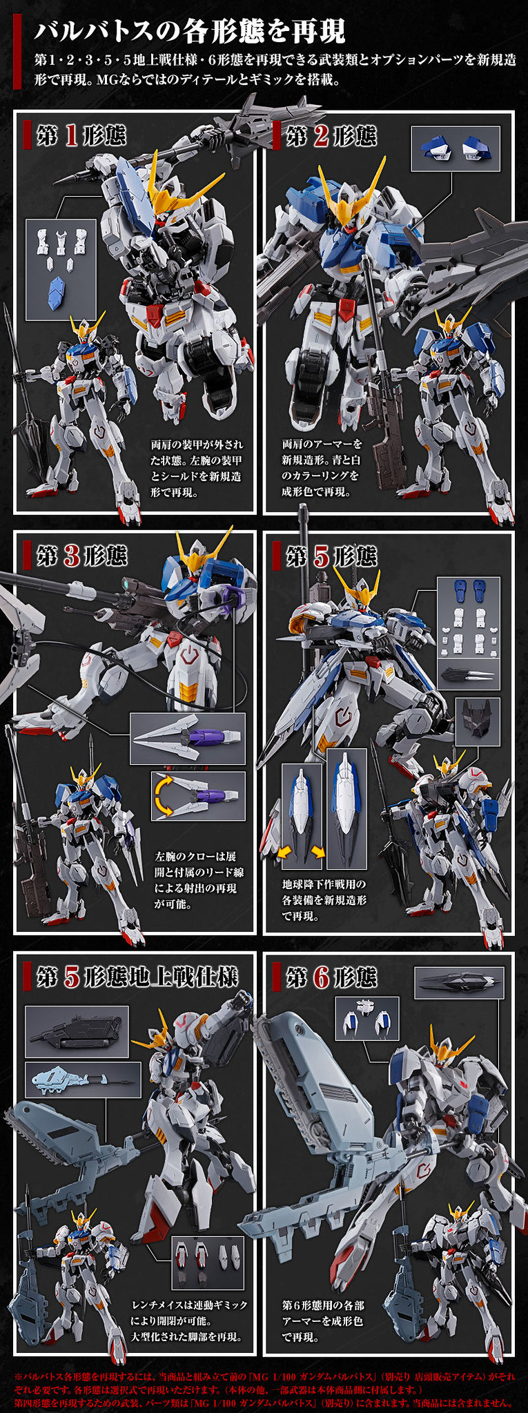 「MG 1/100 獵魔鋼彈用 擴充零件組」收錄了大量零件可與另售的「MG 1/100 獵魔鋼彈(第4形態)」搭配使用,再現第一季登場的1・2・3・5・5地面戰規格・6形態。此外更有 1/100 比例的機動工兵、歐格・伊茲卡人偶、印有鐵華團LOGO、末日號角與鮑德溫家族紋章、損傷細節表現...等多種圖樣的新規水貼紙!