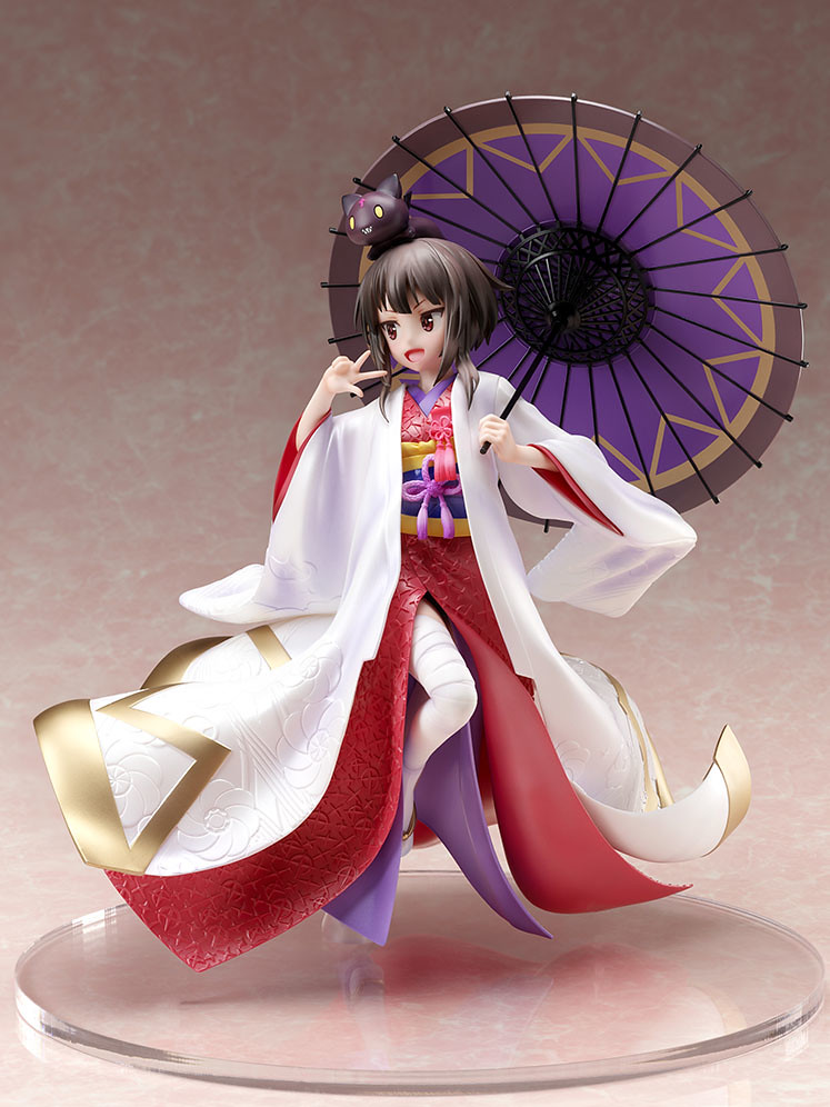 不過即使穿上神聖的白無垢,惠惠依然表現出中二可愛的一面。本體以動畫版造型製作,重現腿部中二的繃帶造型。配件更附上可愛的使魔「點仔」,能讓他趴在惠惠的頭上。