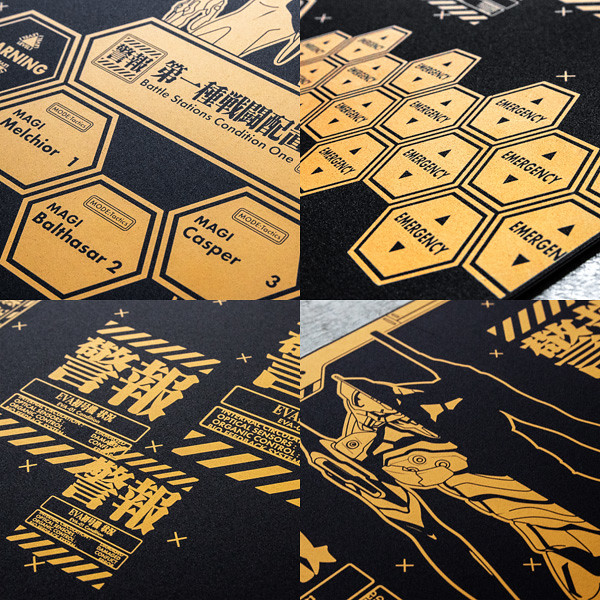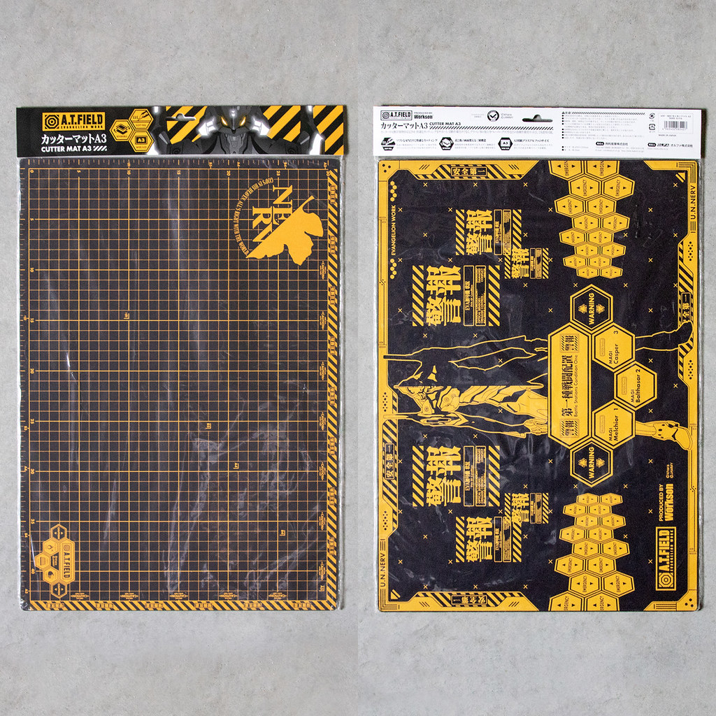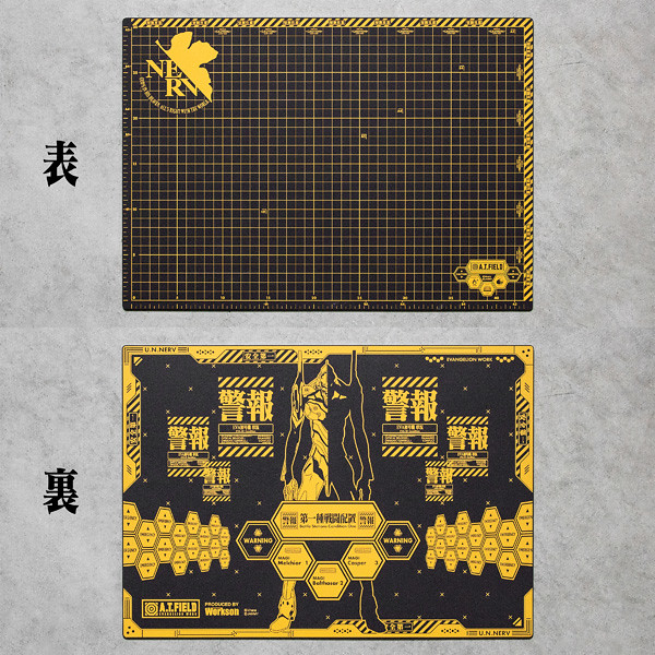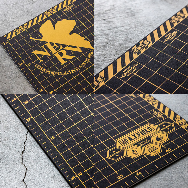 切割墊表面具有 10 mm 、 5 mm的網格,並且包括標準紙張 B5 / A4 / B4 / A3 /明信片 的尺寸標記 。背面則是充滿新世紀福音戰士的世界觀的設計以及初號機的圖樣。