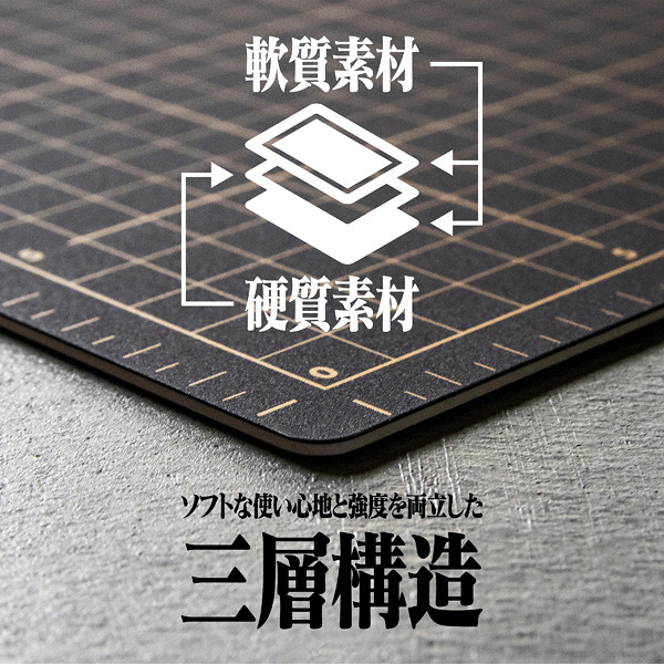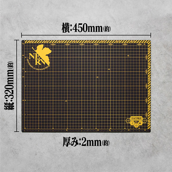 「NERV A3切割墊」以同款設計呈現,尺寸約 450 × 320 × 2 mm,具有硬質材料夾在軟質材料之間的三層結構,切割舒適。