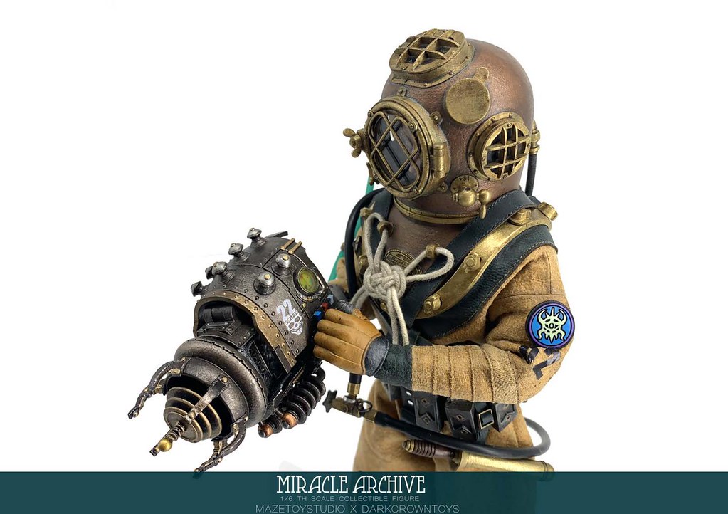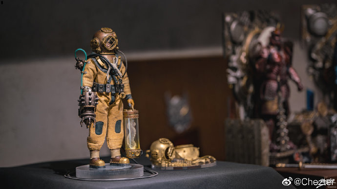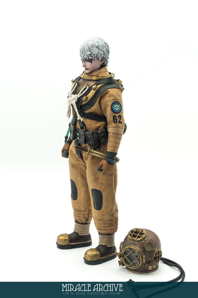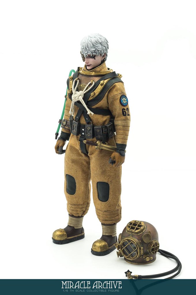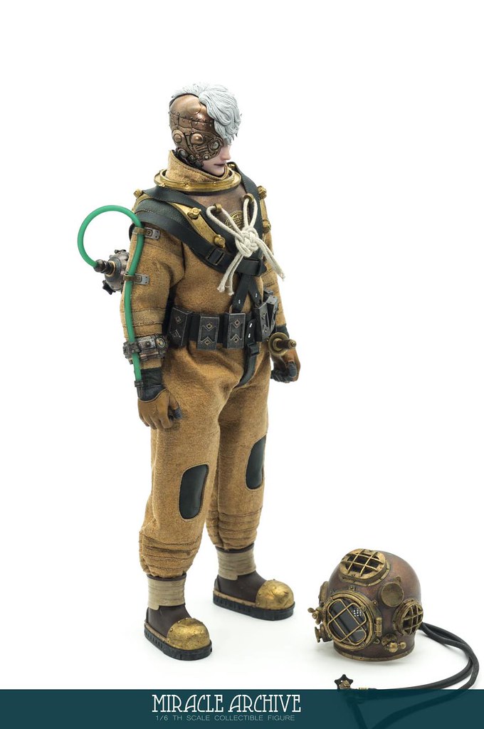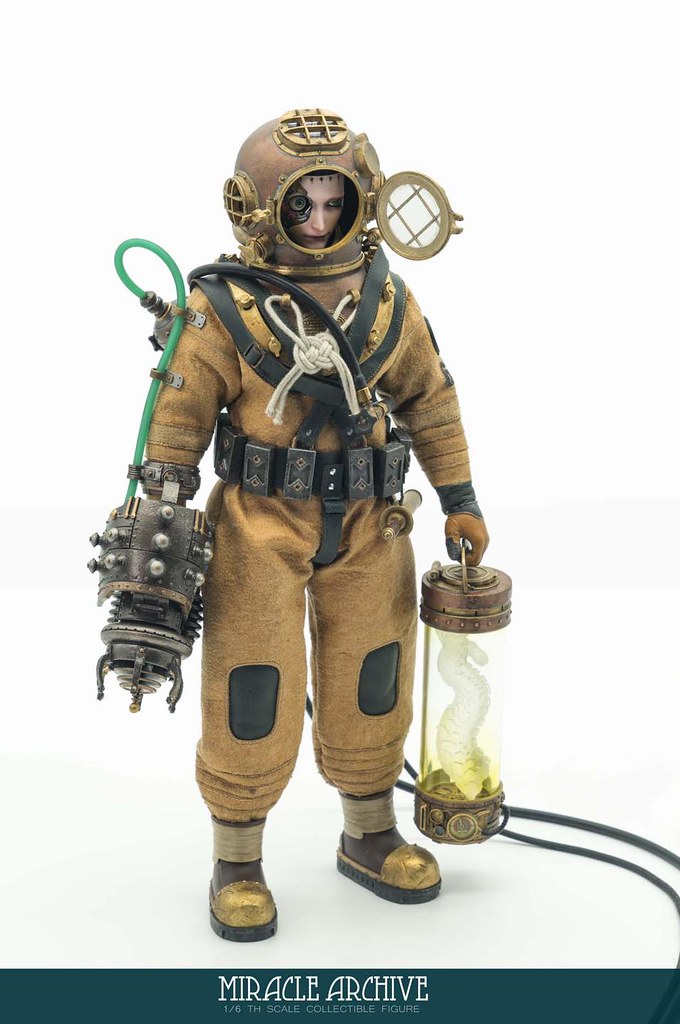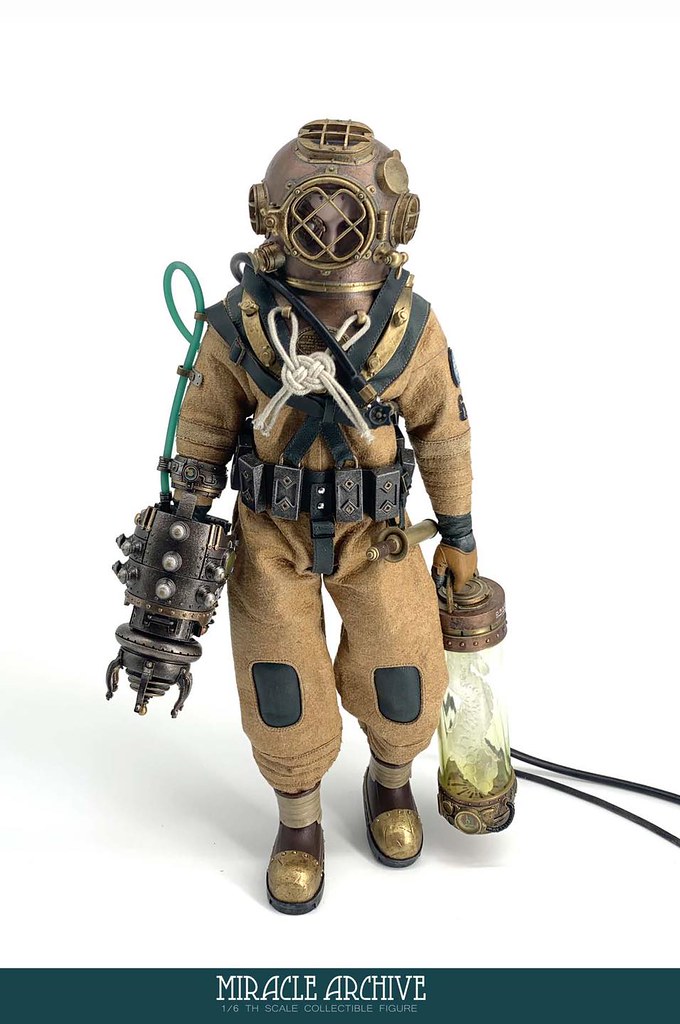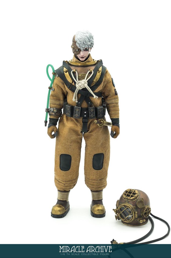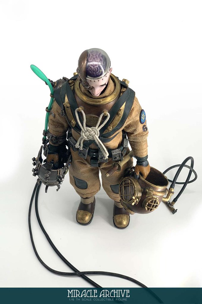 男性的頭雕面容帶有一種著迷於實驗的妖異氣質,目前可以看到留著白髮、露出紫色大腦兩種(有一顆注入潮流感風格的頭雕正在監修中),還能戴上古董樣式的潛水頭盔展現多種風貌,除了潛水服上的裝備背帶、繫繩、臂章這些引人注目的細節之外,也可以拿持蒸氣龐克風格、造型搶眼的培養瓶跟武器,值得一提的是,本作在腳底還設置了磁鐵,可以與地台穩固相連不需支架、達到更好的展示效果!