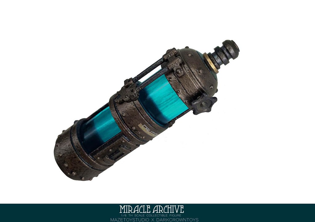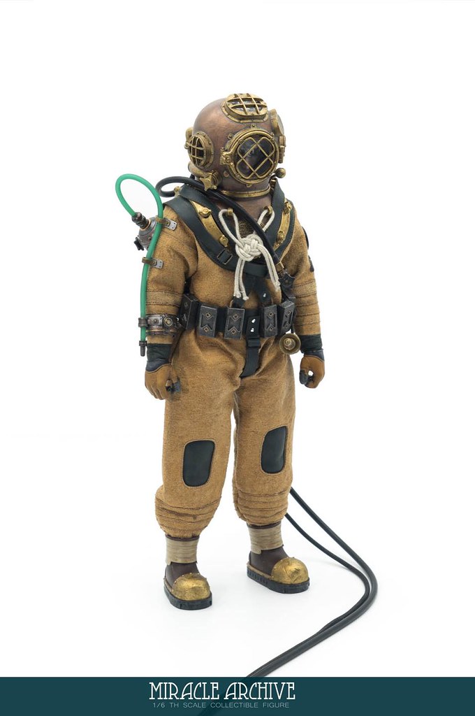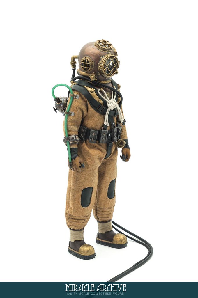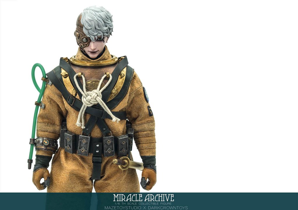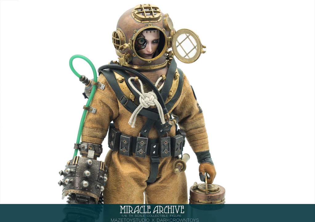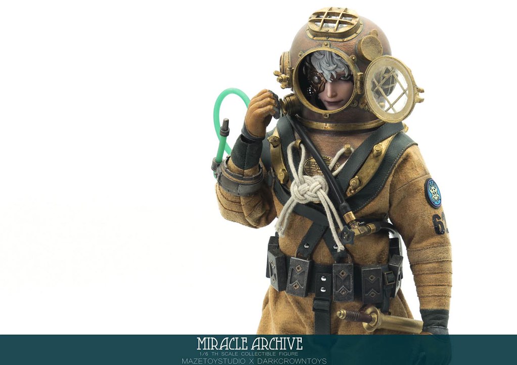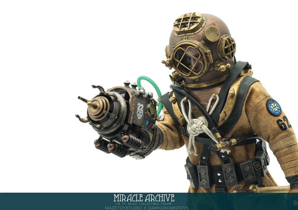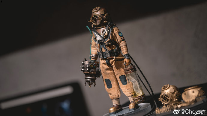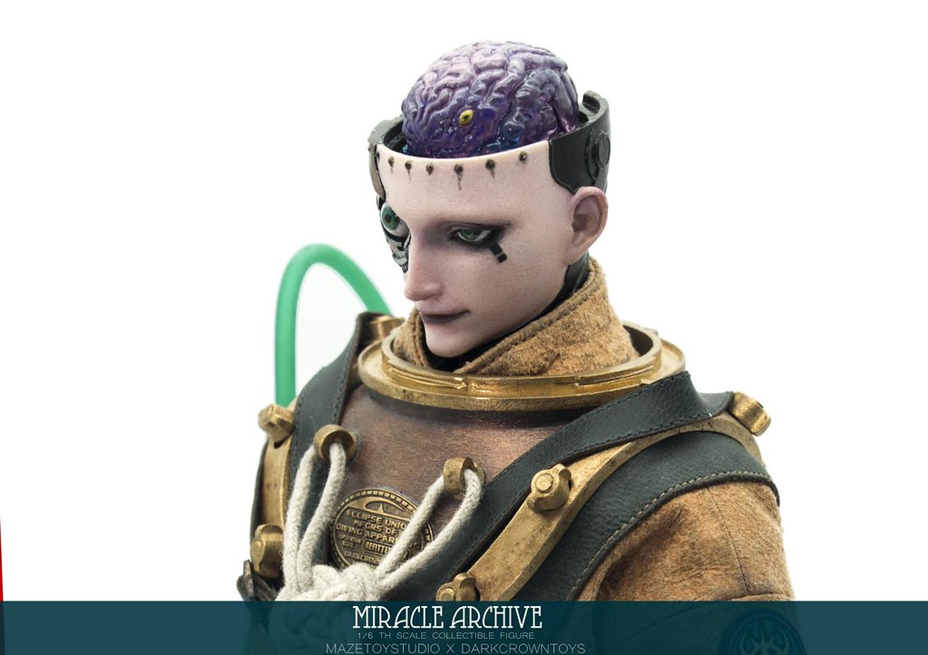 男性的頭雕面容帶有一種著迷於實驗的妖異氣質,目前可以看到留著白髮、露出紫色大腦兩種(有一顆注入潮流感風格的頭雕正在監修中),還能戴上古董樣式的潛水頭盔展現多種風貌,除了潛水服上的裝備背帶、繫繩、臂章這些引人注目的細節之外,也可以拿持蒸氣龐克風格、造型搶眼的培養瓶跟武器,值得一提的是,本作在腳底還設置了磁鐵,可以與地台穩固相連不需支架、達到更好的展示效果!