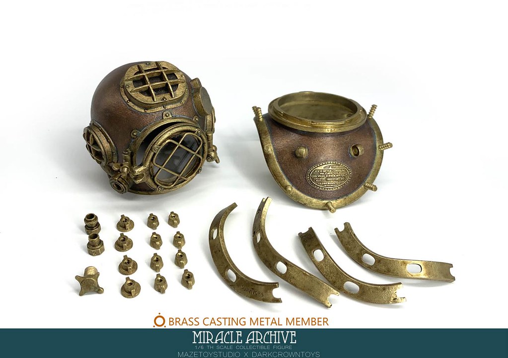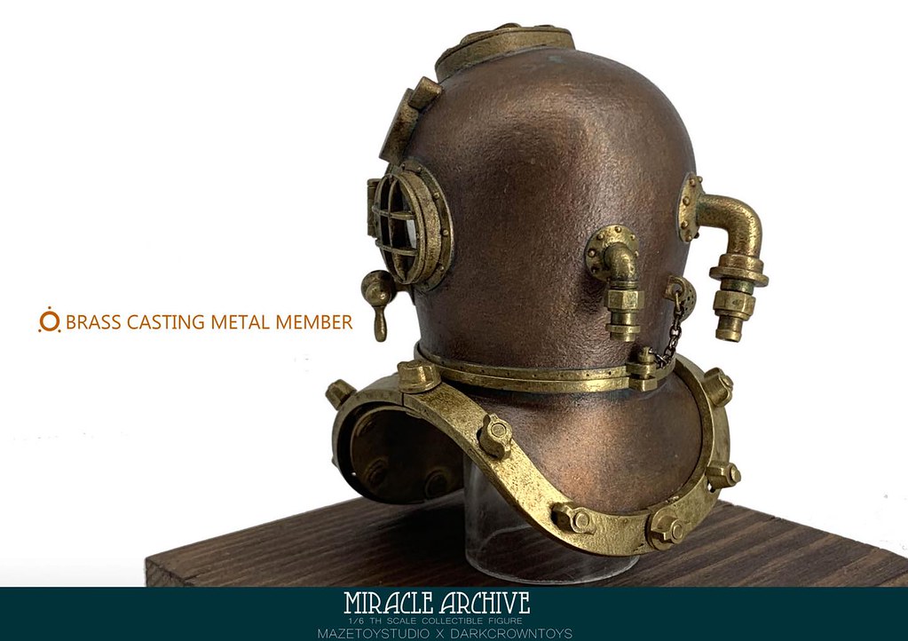 《奇蹟檔案》是以「調查克蘇魯神秘事件」展開深海、陸地探險為題,並融入獵奇、蒸氣龐克......設計元素的 1/6 比例人偶系列,從 2019 年即展開的《奇蹟檔案》系列,意圖以突破格局的製作方式打造出兼具精美細節與設計特色的極致人偶;本次新作的服裝、配備,整體看來是以「深海探勘」為題打造,以鹿皮絨布料、牛皮、黃銅鑄造所完成的潛水裝備擁有超過 30 個部件,光是細緻度就十分驚人啊。