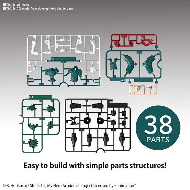 而這次發表的「ENTRY GRADE 綠谷出久」僅使用了 38 個零件,雖在完成後不具備可動性,但套件擁有出色的分件、分色設計,素組完成後補上眼睛貼紙就有相當高的完成度,不須使用具有危險性的剪鉗、膠水、顏料,讓孩童也能輕鬆完成笨久!