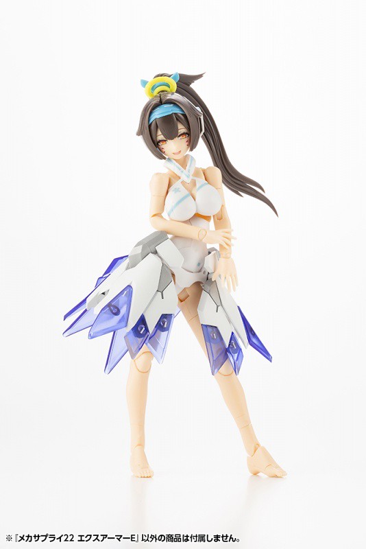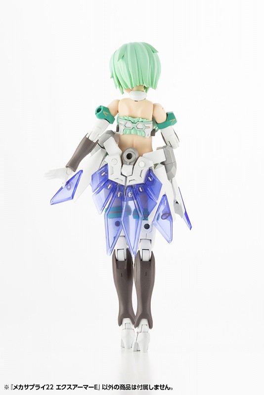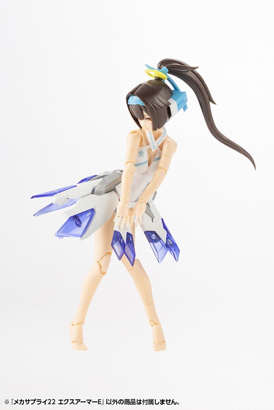 「機械追加裝甲22 EX裝甲E」是一款相當適合美少女組裝模型的套件,由白色、透明藍兩色成形,造型與零件分件相當精緻,幾乎每片裙甲都有獨立出來,並採用共通的 3mm 卡榫連結,對於模型改造來說相當便利。