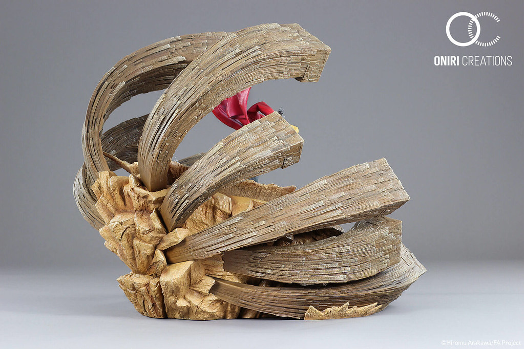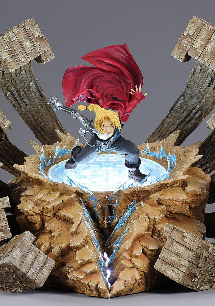 底座不僅以向前衝的誇張拳頭打造,更以透明材質製作了鍊成陣地台,配備有LED發光效果,讓這尊雕像更加引人注目! 鍊金術所發出來的特效也是由透明材料製成的,以增加真實感。