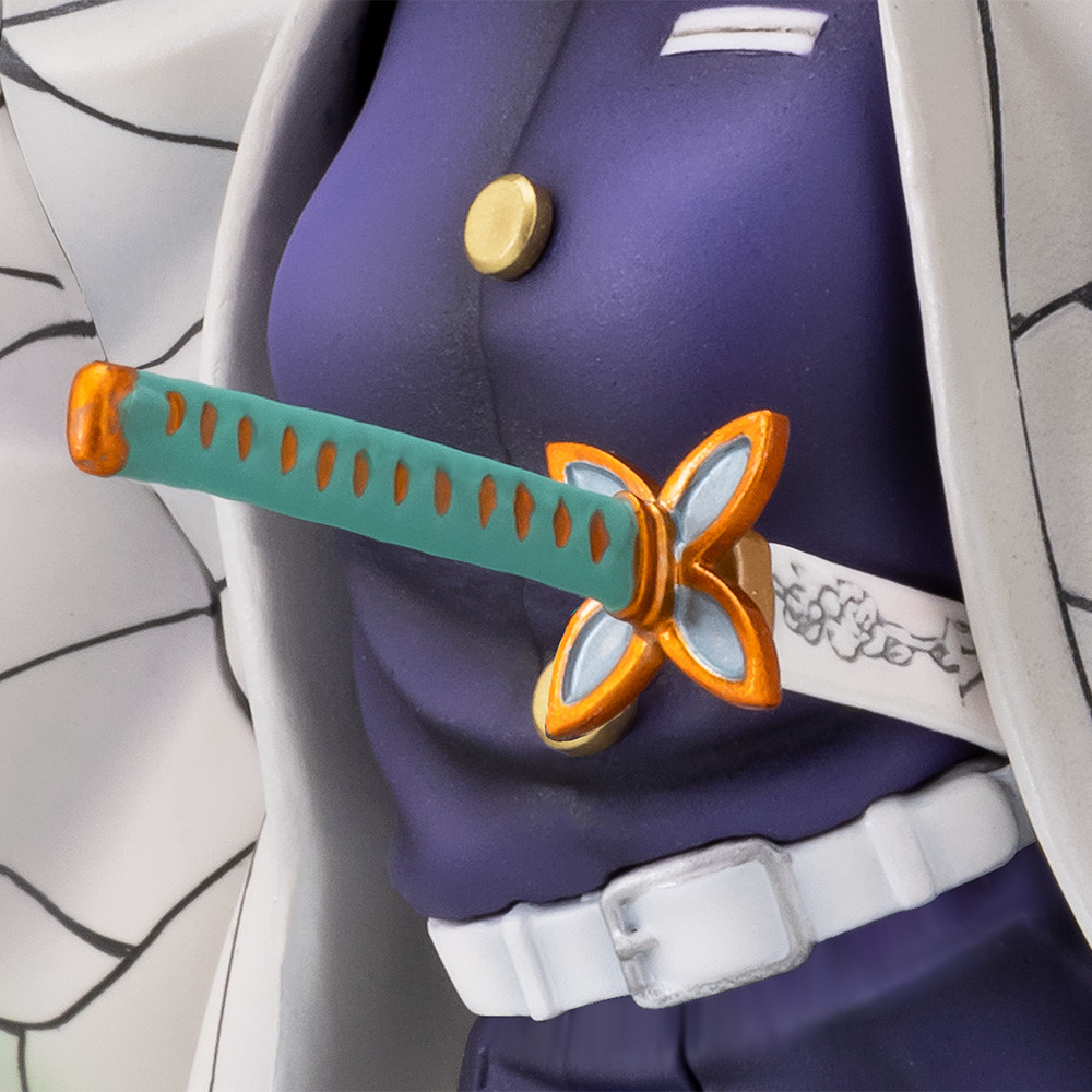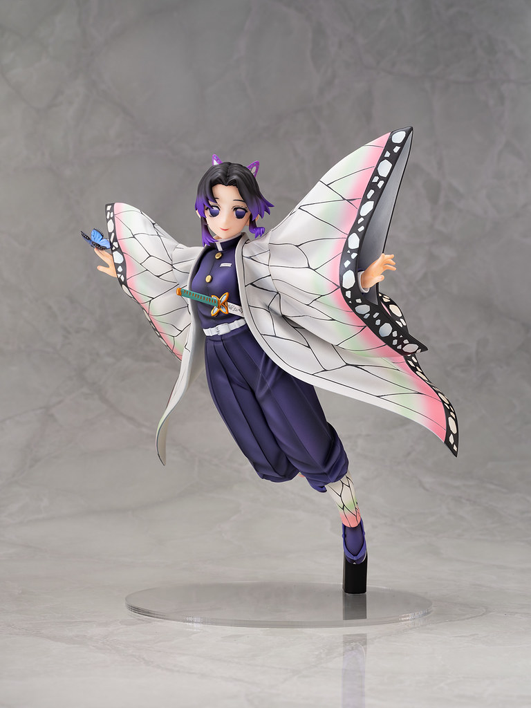 「胡蝶忍」1/7比例塗裝完成品,尺寸約高 25 公分,將動畫中的精彩場景立體化重現,胡蝶忍溫柔一笑的表情十分有魅力,體態纖細輕盈;伸展開時有如蝴蝶翅膀的招牌羽織,施以帶有珠光塗裝,呈現淡綠色到粉紅色的美麗漸層色彩,搭配細緻的紋路與充滿動態感飛舞的姿勢,宛如蝴蝶翩翩起舞。標誌性的深紫色蝴蝶髮夾、指尖的蝴蝶也精緻呈現。