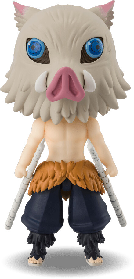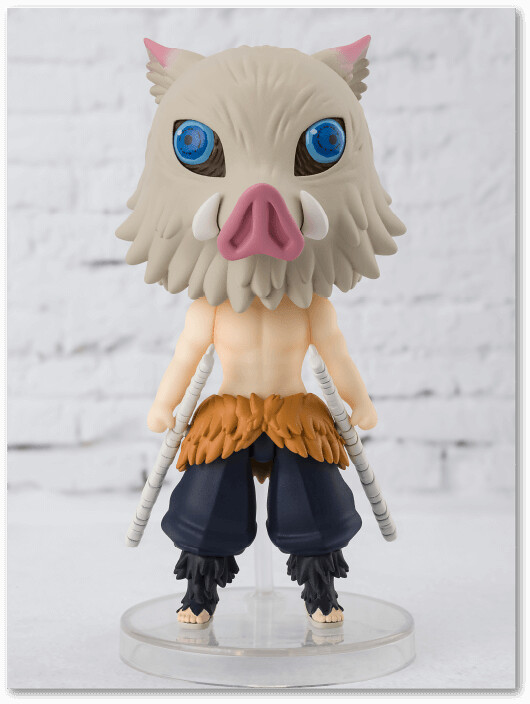 Figuarts mini 嘴平伊之助,以頭戴灰色的山豬面具的造型呈現,雖然是可愛 Q 版設計,但裸露的上半身依然精壯魁武!除了腰間插著雙刀的造型,另外附有破損如鋸齒的雙刀配件,可以重現戰鬥狀態!