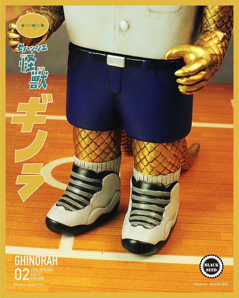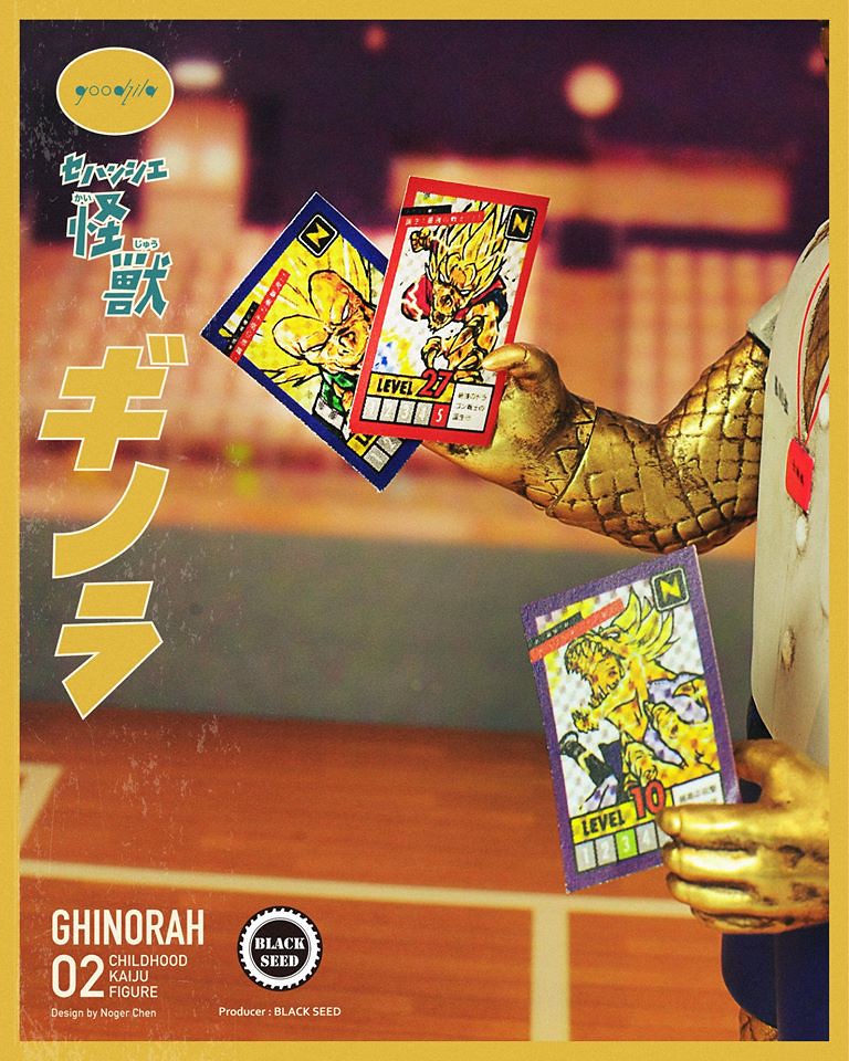 「細漢時ㄟ怪獸 セハンシラ」以小時候看見混合多種無版權商標的盜版玩具為創作靈感,把這種混雜、多重拼湊的概念集結在吊卡玩具裡。這次金光閃閃的基NO拉實體,身穿著士林國制服,有著姓名繡與學號、平安符等細節。全高約18公分,塗裝採人手上色舊化,每隻都有獨一無二的刷舊。配件包含有火焰球、小NO吉拉玩偶,以及有著刺蝟頭的超級閃卡!