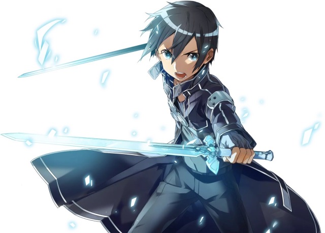 首先是桐人(桐谷和人),線上遊戲玩家SAO生還者,主要武器是單手劍,擁有全玩家中最高的反應速度,攻略第50層頭目後獲得獨特技能「二刀流」,此後便會同時裝備兩把單手劍,分別為黑色劍身的「闡釋者」和碧綠色劍身的「逐闇者」。較著名的SAO劍技有「水平四方斬」、斜斬、奪命擊,而二刀流的劍技有「星爆氣流斬」、「日蝕」和「雙重扇形斬」。