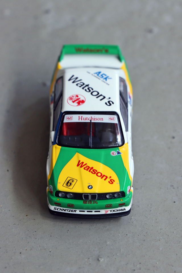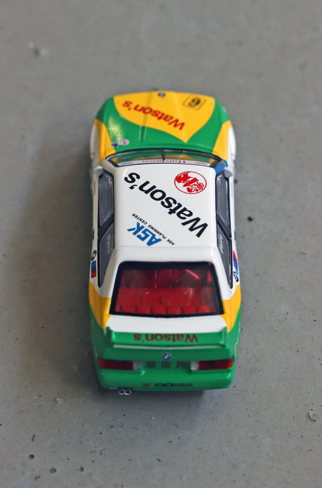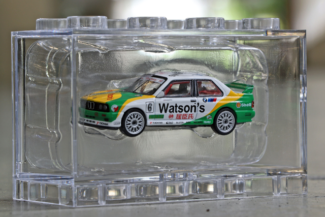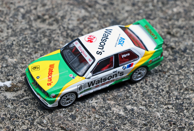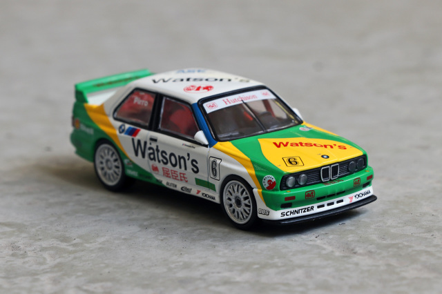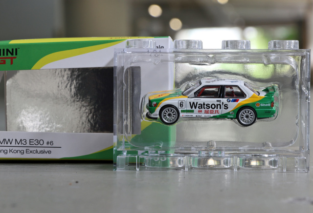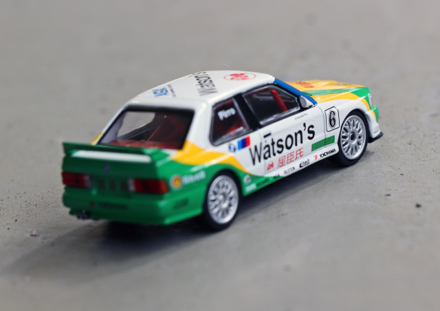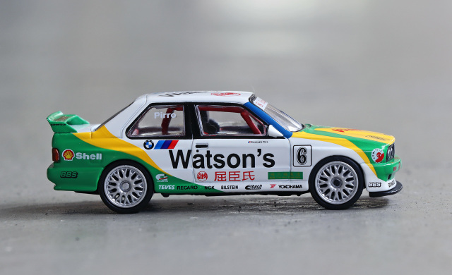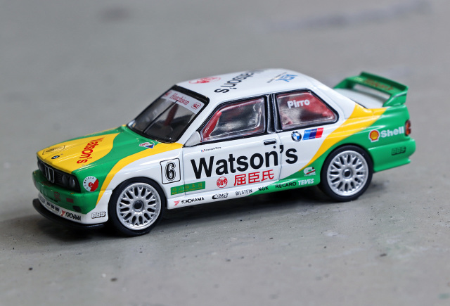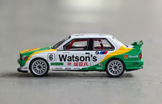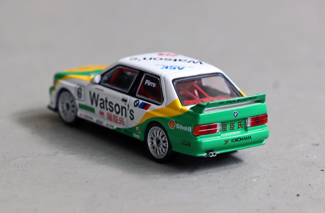 MINI GT 推出招牌 1991 年澳門東望洋 Pirro 冠軍車配上經典蒸餾水拉花配色的寶馬 M3 E30 合金車!優點方面細節如移印及拉花位準確,QC 不俗。Watsons、Yokohama 及 NGK 等各移印圖案清晰而精細。獨立圓膠頭燈、長方形尾燈等造型重現;車廂內座位及防滾架造工不俗,香港版更有 T-brick 盒包裝,加分。整台車重現當年車身拉花,輪圈更與真車幾乎相同。